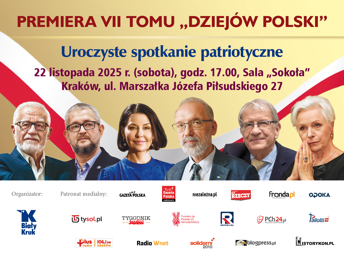 Premiera VII tomu monumentalnych „Dziejów Polski” – „Upadanie i powstawanie (1673- 1763)”, odbędzie się już w najbliższą sobotę, 22 listopada 2025 r., w Sali „Sokoła” w Krakowie, przy ul. Marszałka Piłsudskiego 27.