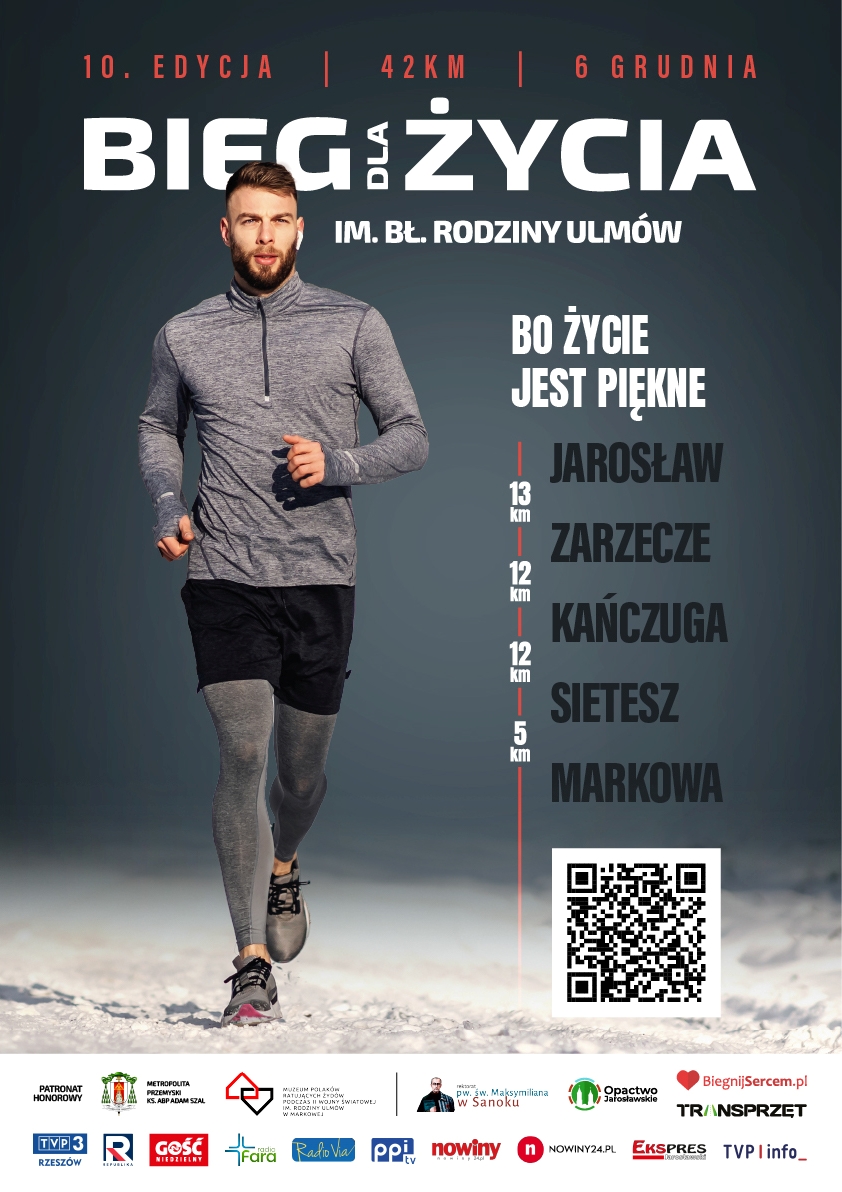Już po raz dziesiąty biegacze, rodziny i młodzież spotkają się na wyjątkowej trasie z Jarosławia do Markowej, by wspólnie uczcić dar życia. X Bieg dla Życia im. błogosławionej Rodziny Ulmów odbędzie się 6 grudnia, a jego 42-kilometrowa trasa poprowadzi przez Jarosław, Zarzecze, Kańczugę, Sietesz aż do Markowej.