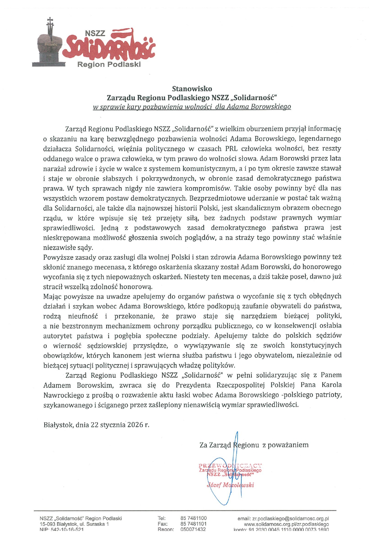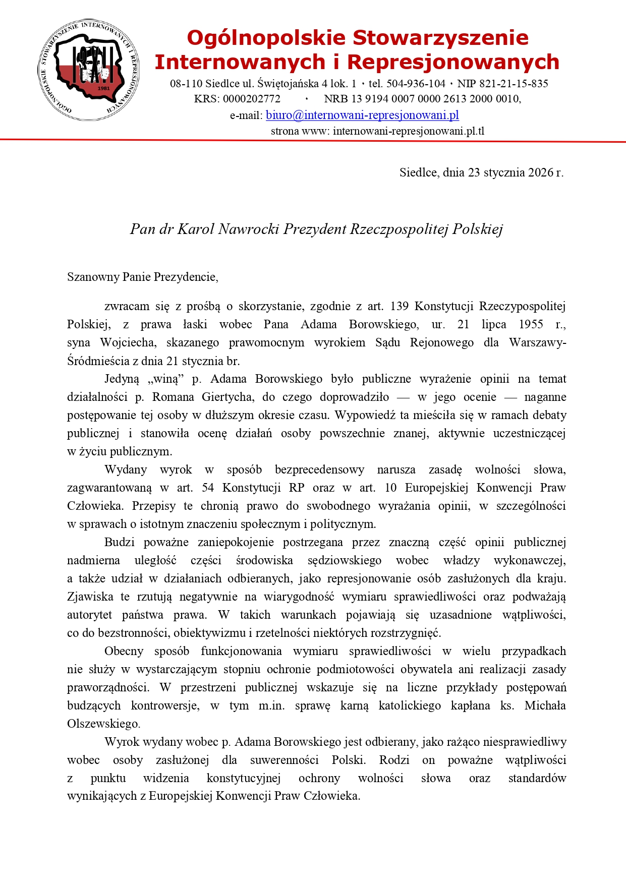 Zarząd Regionu Podlaskiego NSZZ "Solidarność" oraz Ogólnopolskie Stowarzyszenie Internowanych i Represjonowanych zwróciły się do prezydenta Polski Karola Nawrockiego o skorzystanie z przysługujących uprawnień konstytucyjnych i zastosowanie prawa łaski w postaci ułaskawienia Adama Borowskiego. Oba listy publikujemy poniżej w całości