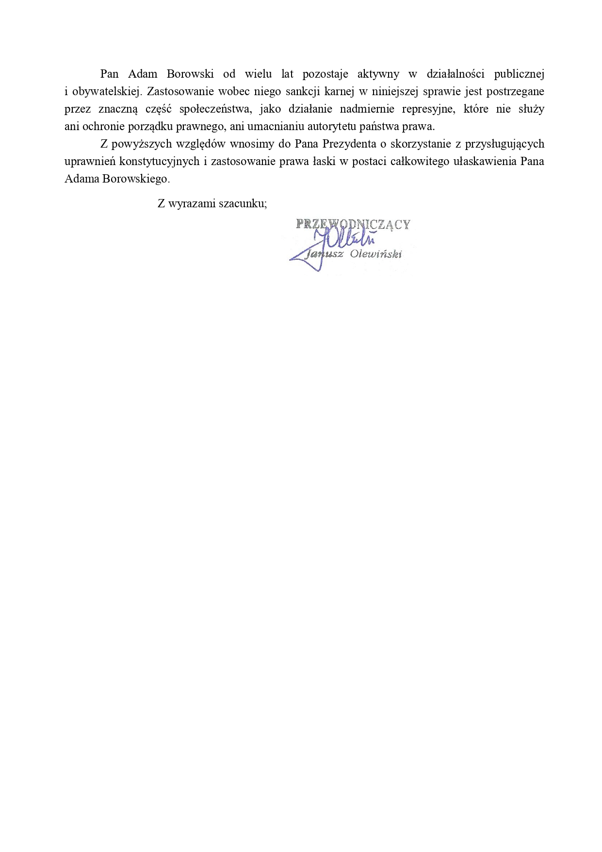 Natomiast dzisiaj Janusz Olewiński Ogólnopolskiego ze Stowarzyszenia Internowanych i Represjonowanych wystosował list do prezydenta Polski Karola Nawrockiego o skorzystanie, zgodnie z art. 139 Konstytucji Rzeczypospolitej Polskiej, z prawa łaski wobec Pana Adama Borowskiego.