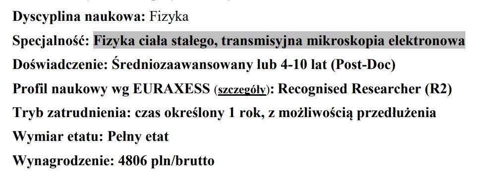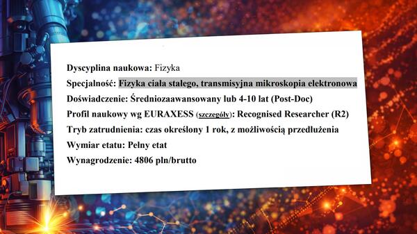 Instytut Fizyki Polskiej Akademii Nauk (IF PAN) ogłosił konkurs na stanowisko asystenta w Zespole Mikroskopii Elektronowej, który wywołał poruszenie w środowisku naukowym. Wymagania stawiane kandydatowi są wyjątkowo wysokie. Obowiązkowe jest posiadanie doktoratu z fizyki oraz 4–10 lat doświadczenia zawodowego, biegła znajomość języka angielskiego i umiejętność pracy pod presją czasu. Co więcej, przyszły asystent ma obsługiwać ultranowoczesny transmisyjny mikroskop elektronowy Titan Cubed 80–300 do badań nanostruktur na poziomie atomowym, którego wartość liczona jest w milionach złotych. Do jego zadań będzie należeć m.in. prowadzenie zaawansowanych eksperymentów nanomateriałowych (badanie grafenu i nanorurek węglowych, tworzenie funkcjonalnych nanostruktur), analiza wyników z wykorzystaniem metod Big Data i uczenia maszynowego, rozwijanie metod ilościowych (np. modelowanie nanostruktur metodą elementów skończonych FEM) oraz automatyzacja eksperymentów pomiarowych. Od kandydata oczekuje się również umiejętności pozyskiwania grantów badawczych z Narodowego Centrum Nauki i funduszy europejskich, a więc aktywności naukowej na najwyższym poziomie. Krótko mówiąc – wymagania niemal “postdokowskie” (profil R2 w klasyfikacji EURAXESS, czyli Recognised Researcher z kilkuletnim stażem) dla osoby mającej wnieść znaczący wkład w badania instytutu.