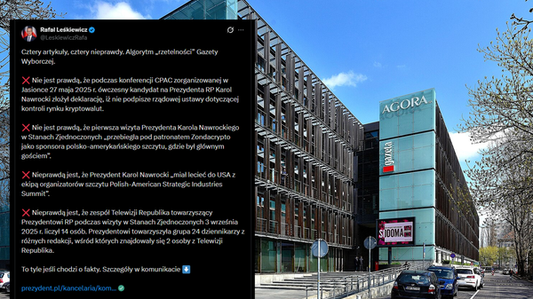 Cztery artykuły, cztery nieprawdy. Algorytm „rzetelności” Gazety Wyborczej - napisał na portalu "X" podsekretarz stanu w Kancelarii Prezydenta RP Rafał Leśkiewicz. Kancelaria Prezydenta RP żąda od „Gazety Wyborczej” sprostowania artykułów z nieprawdziwymi informacjami.