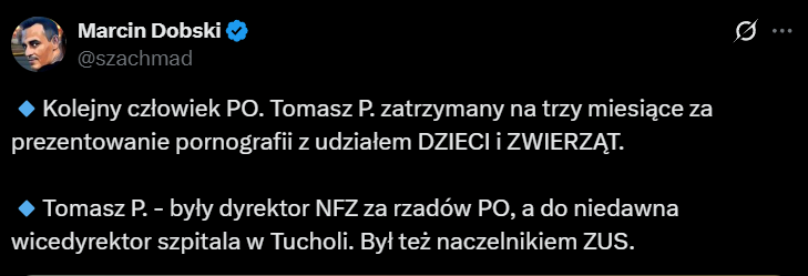 "Kolejny człowiek PO. Tomasz P. zatrzymany na trzy miesiące za prezentowanie pornografii z udziałem DZIECI i ZWIERZĄT" - ujawnił na platfomie X Marcin Dobski. To były dyrektor NFZ za rządów PO, a do niedawna wicedyrektor szpitala w Tucholi.