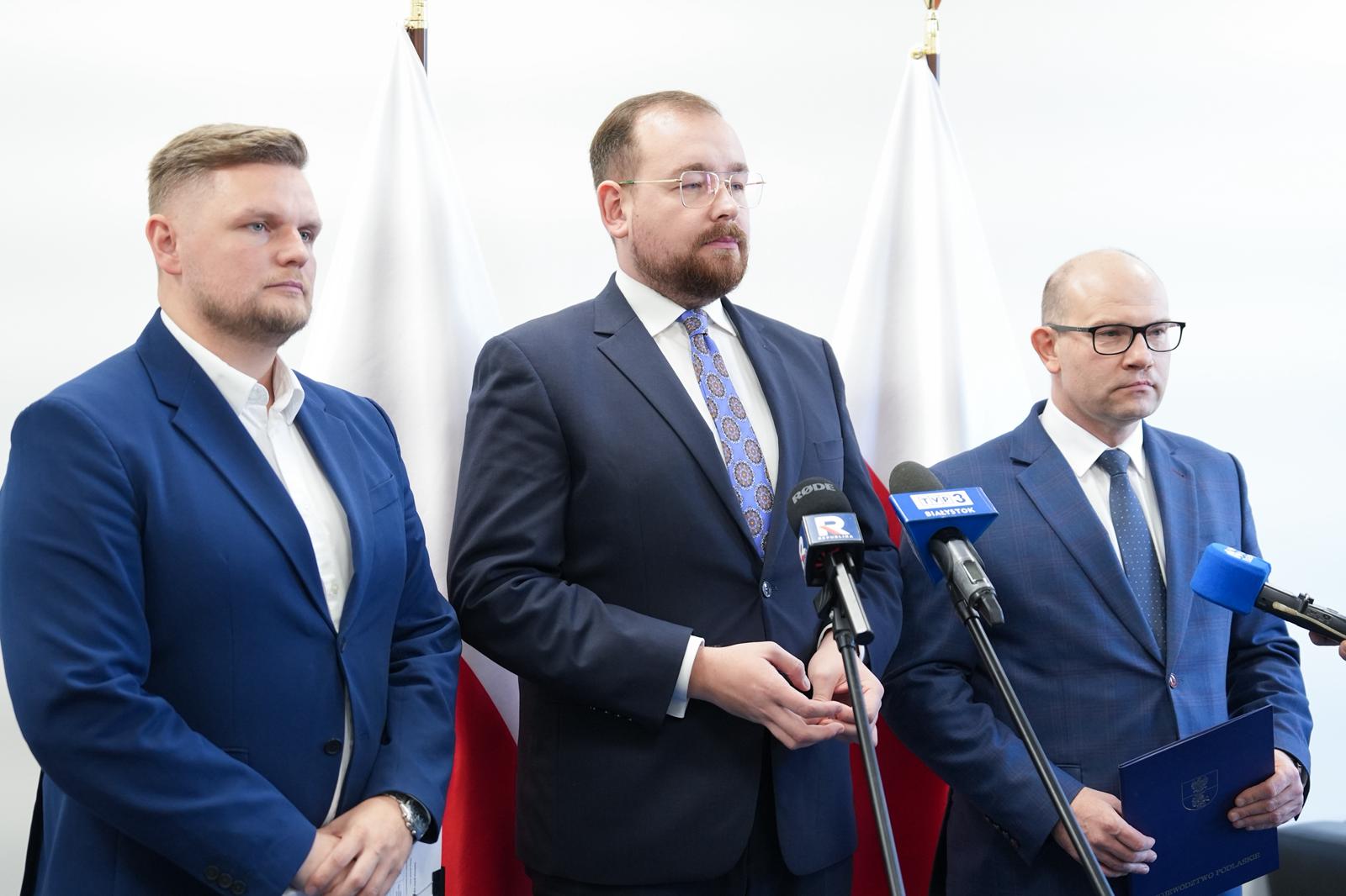 Politycy PiS z Podlaskiego — Artur Kosicki, Sebastian Łukaszewicz i Robert Jabłoński — złożyli do prokuratury zawiadomienie o podejrzeniu popełnienia przestępstwa przez Zarząd Województwa Podlaskiego oraz obecną minister zdrowia Jolantę Sobierańską-Grendę. Jak twierdzą wnioskodawcy, w sprawie umowy z 23 grudnia 2024 r. na opracowanie strategii konsolidacji szpitali wypłacono wynagrodzenie mimo braku finalnej strategii, harmonogramu i projektów uchwał; w zawiadomieniu wskazano art. 231 §1 i art. 286 §1 k.k. Sprawa dotyczy gospodarowania środkami publicznymi i — na tym etapie — ma charakter zarzutów wymagających weryfikacji przez organy ścigania.