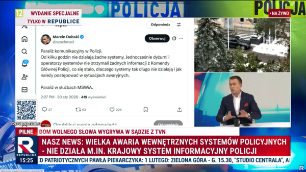 Dziennikarz Telewizji Republika Marcin Dobski alarmuje o paraliżu komunikacyjnym w Policji. Chodzi o wielką awarię Krajowego Systemu Informacyjnego Policji (KSIP) i System Wspomagania Dowodzenia (SWD). Brak zdecydowanej reakcji ze strony MSWiA jedynie pogłębia chaos. W mediach społecznościowych policja potwierdziła awarię systemów informatycznych.