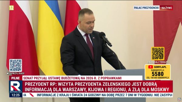Od pierwszych dni wojny udzieliśmy wsparcia Ukrainie. Rozmawialiśmy dziś o pomocy militarnej i humanitarnej. Obaj mamy świadomość tej pomocy i dysponujemy jej wykazami - powiedział prezydent Polski Karol Nawrocki. Jak zauważył przywódca Polski "ta wizyta jest dowodem, że w kwestiach strategicznych, naszej strategicznej współpracy w zakresie kwestii bezpieczeństwa Polska, Ukraina kraje regionu, kraje wypełnione wartościami demokratycznymi są razem i to nigdy nie ulegało wątpliwościom".