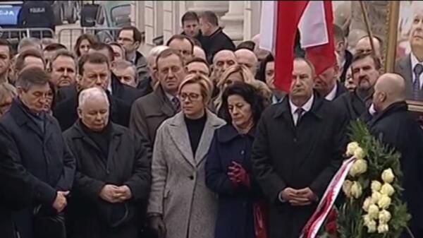 Delegacja Prawa i Sprawiedliwości na czele z prezesem Jarosławem Kaczyńskim. tradycyjnie – o godzinie 8:41 – złożyła kwiaty pod Pałacem Prezydenckim.