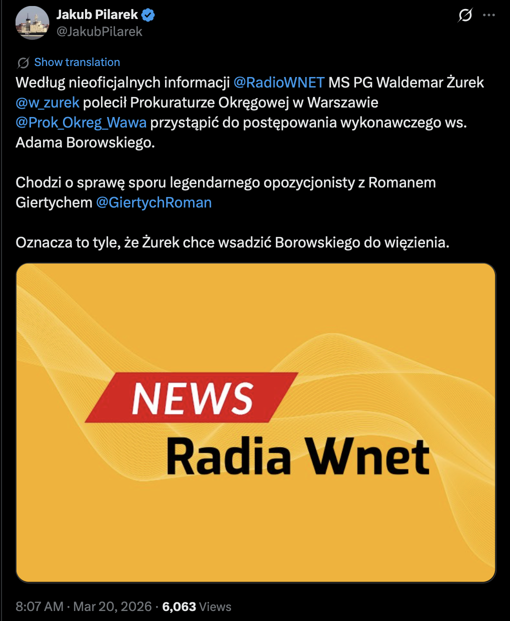 "Według nieoficjalnych informacji Radia Wnet, minister sprawiedliwości, prokurator generalny Waldemar Żurek polecił Prokuraturze Okręgowej w Warszawie przystąpić do postępowania wykonawczego ws. Adama Borowskiego" - przekazał w mediach społecznościowych Jakub Pilarek, dziennikarz "Wnetu".