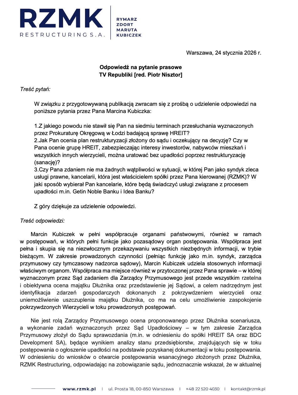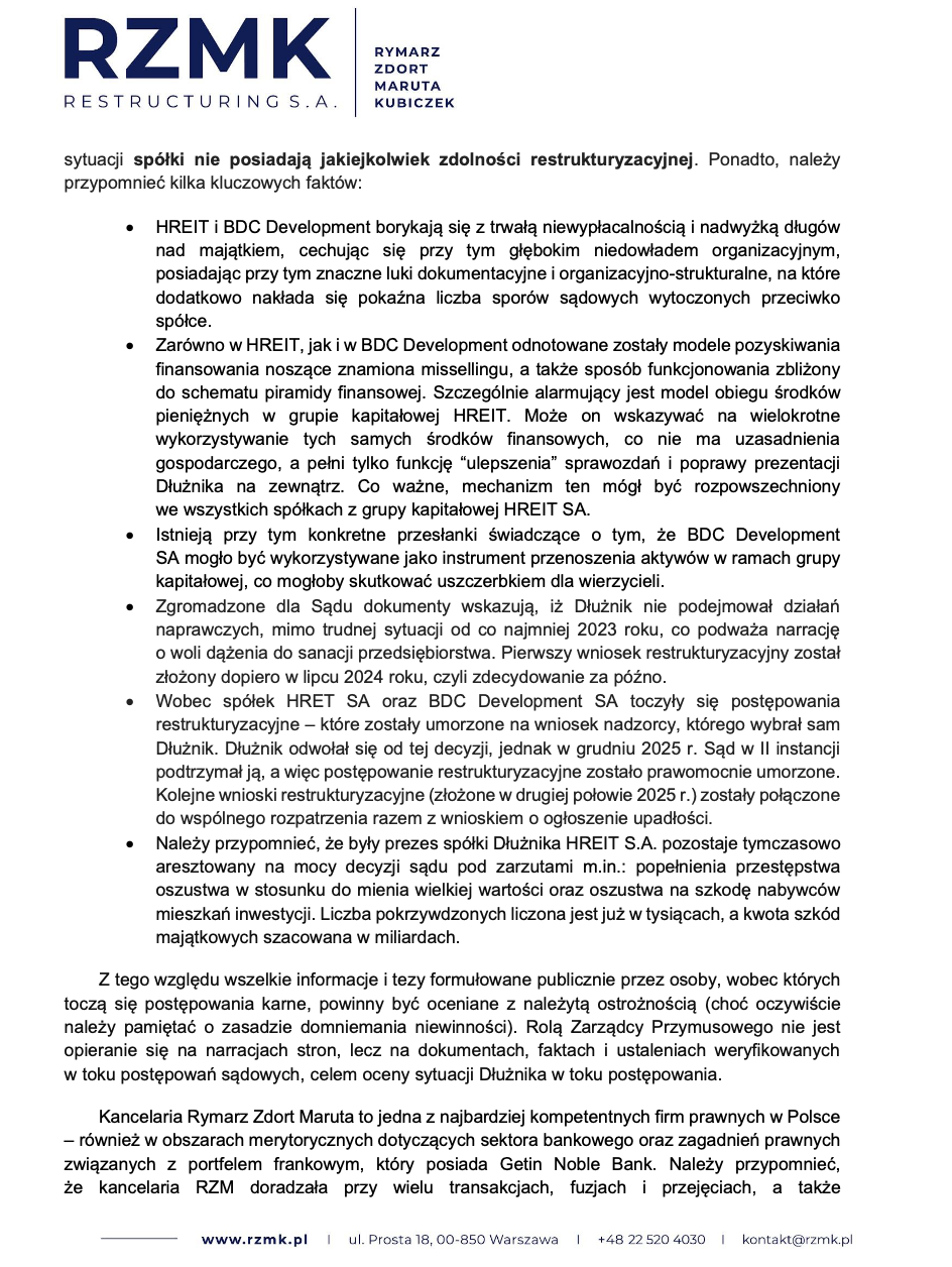 • Należy przypomnieć, że były prezes spółki Dłużnika HREIT S.A. pozostaje tymczasowo