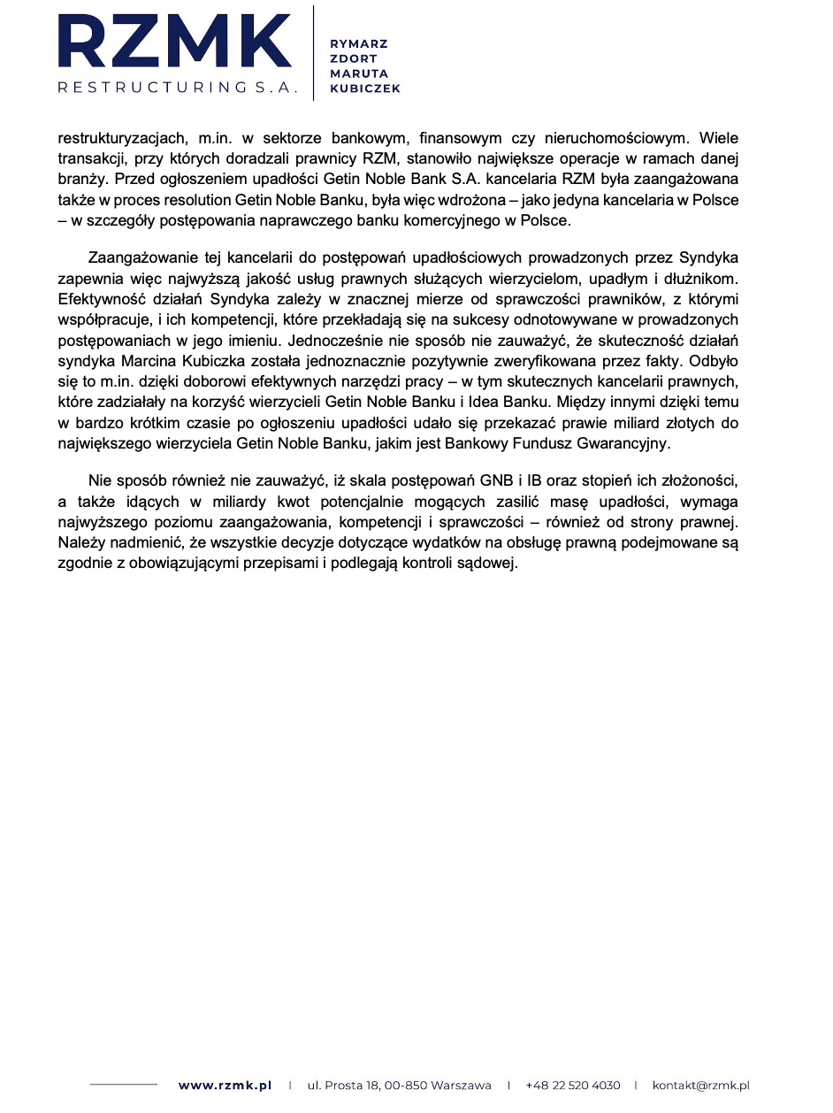 branży. Przed ogłoszeniem upadłości Getin Noble Bank S.A. kancelaria RZM była zaangażowana