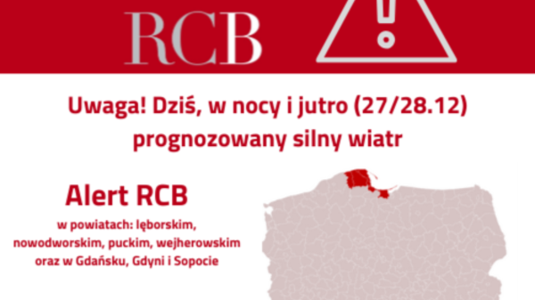 Dziś, w nocy i jutro (27/28.12) prognozowany silny wiatr. Unikaj otwartych przestrzeni, zabezpiecz dobytek - informuje Rządowe Centrum Bezpieczeństwa. Ostrzeżenie przesłano do osób znajdujących się w powiecie: lęborskim, nowodworskim, puckim, wejherowskim oraz w Gdańsku, Gdyni i Sopocie (woj. pomorskie).