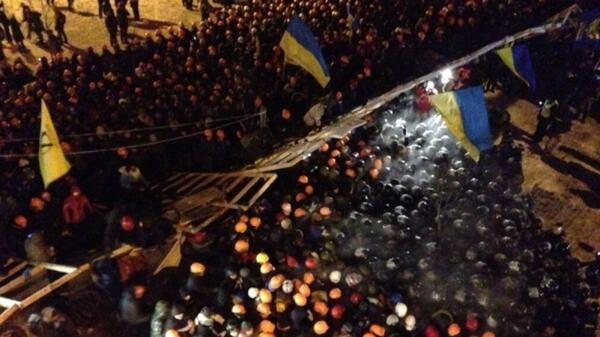 Wyekwipowani w kaski, pałki i tarcze milicjanci natarli na ten główny plac ukraińskiej stolicy w czasie, gdy na Ukrainie składa wizytę szefowa unijnej dyplomacji Catherine Ashton oraz zastępczyni sekretarza stanu USA ds. Europy i Eurazji Victoria Nuland. Milicja nie używała pałek lecz wypierała ludzi krok po kroku, naciskając na nich tarczami. Co najmniej kilkanaście osób zostało poszkodowanych.