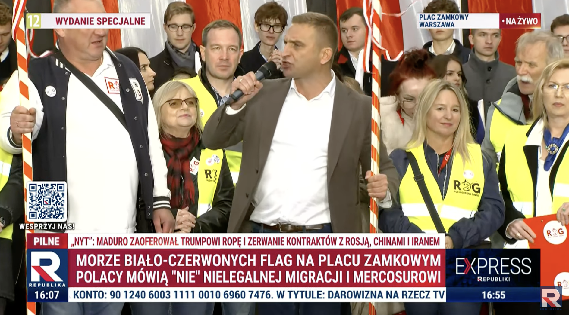 Lider Ruchu Obrony Granic Robert Bąkiewicz wystąpił dziś na Placu Zamkowym w Warszawie podczas protestu „Stop nielegalnej migracji! Nie dla umowy z Mercosur!”. W mocnym przemówieniu dziękował prezesowi Republiki Tomaszowi Sakiewiczowi oraz Michałowi Rachoniowi za wsparcie patriotycznych inicjatyw. Podkreślał, że Polacy potrafią stawić opór polityce Donalda Tuska i zagrożeniom płynącym z Brukseli.
