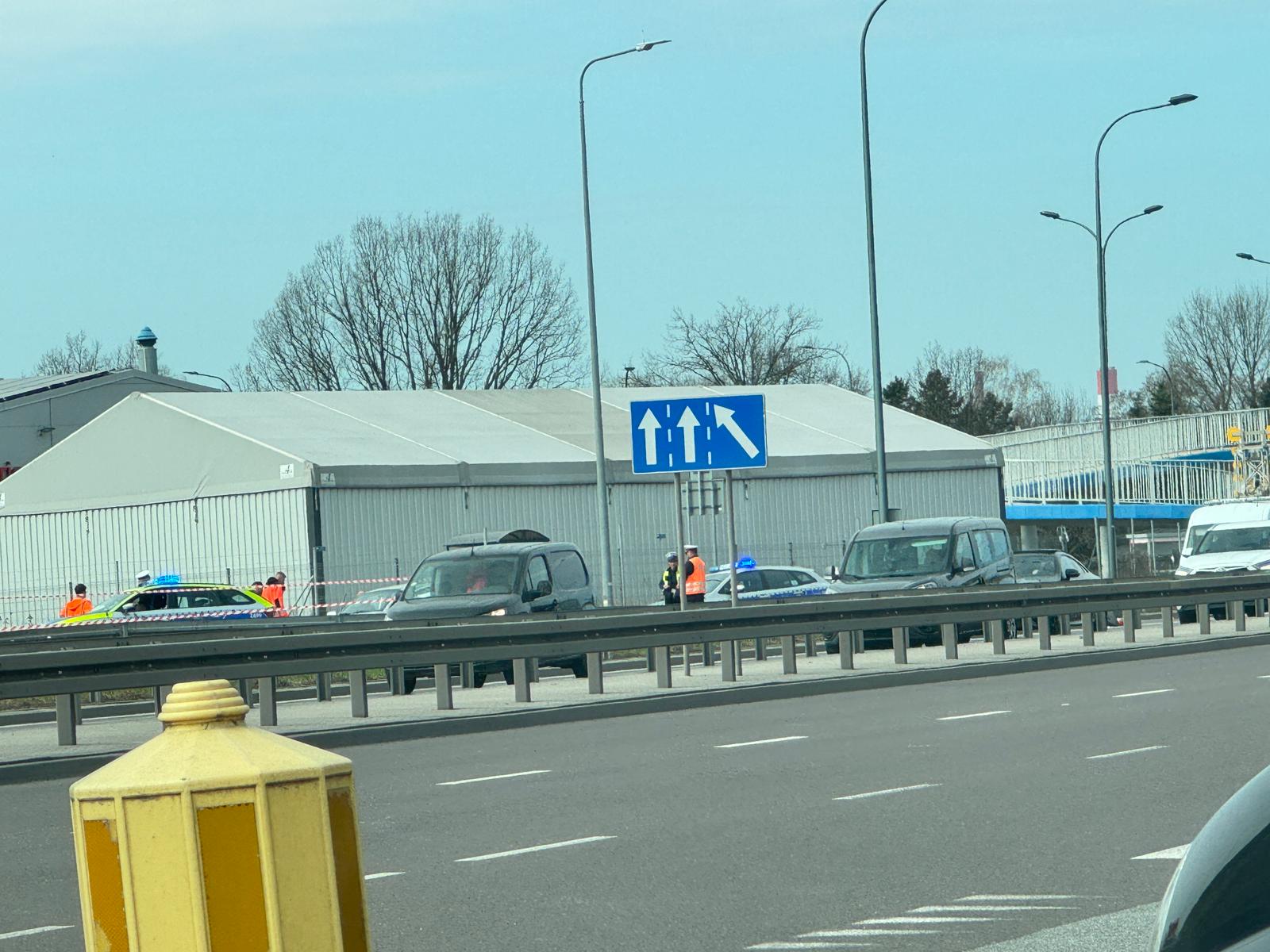 Na miejscu pracują dwa zastępy straży pożarnej, a wjazd na trasę S2 pozostaje zablokowany.