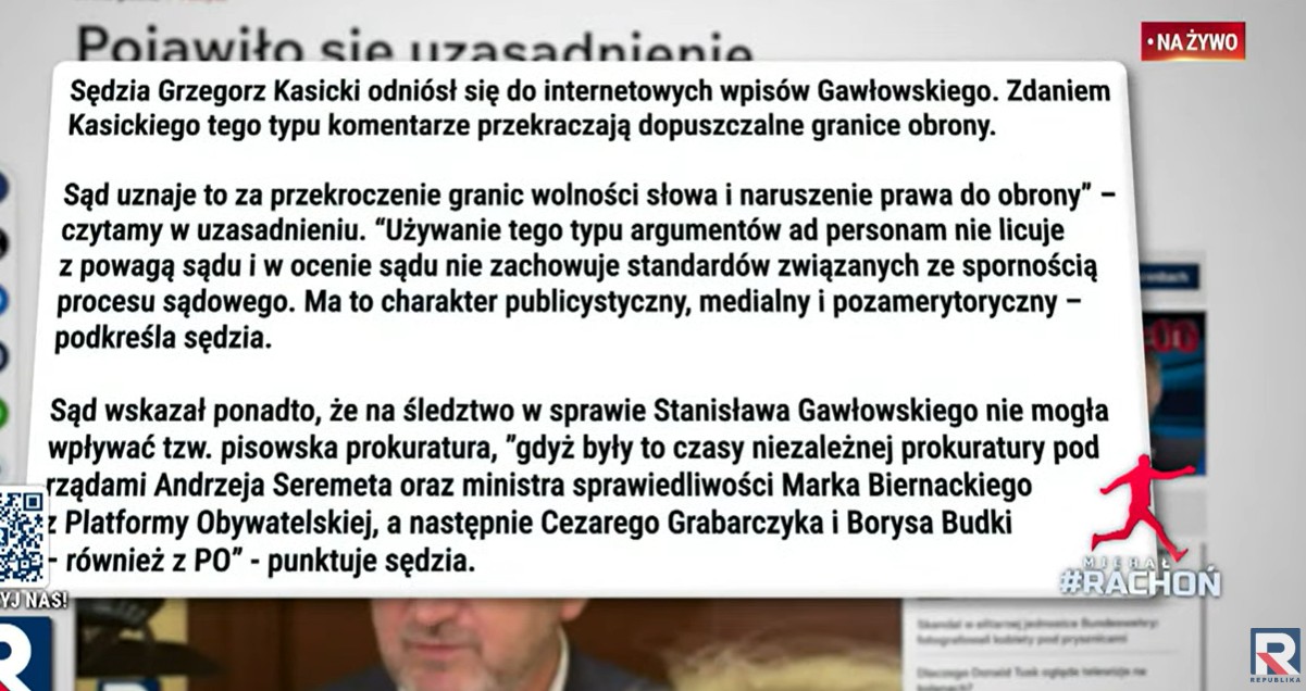 Sędzia Grzegorz Kasicki podważył internetowe wpisy Gawłowskiego, w których zarzucał on śledczym polityczne motywacje, pisząc o "pisowskich prokuratorach".