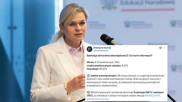 Profil „Emocje w sieci”, regularnie publikujący i komentujący raporty dotyczące bieżących tematów królujących w mediach społecznościowych, przebadał wpisy z 8 i 9 kwietnia dotyczące reakcji internautów na zapowiedzi wprowadzenia od nowego roku szkolnego obowiązkowej nauki edukacji zdrowotnej. Barbara Nowacka, która wbrew rodzicom i uczniom zamierza wprowadzić kontrowersyjny przedmiot w szkołach, z wyników badania zadowolona nie będzie.