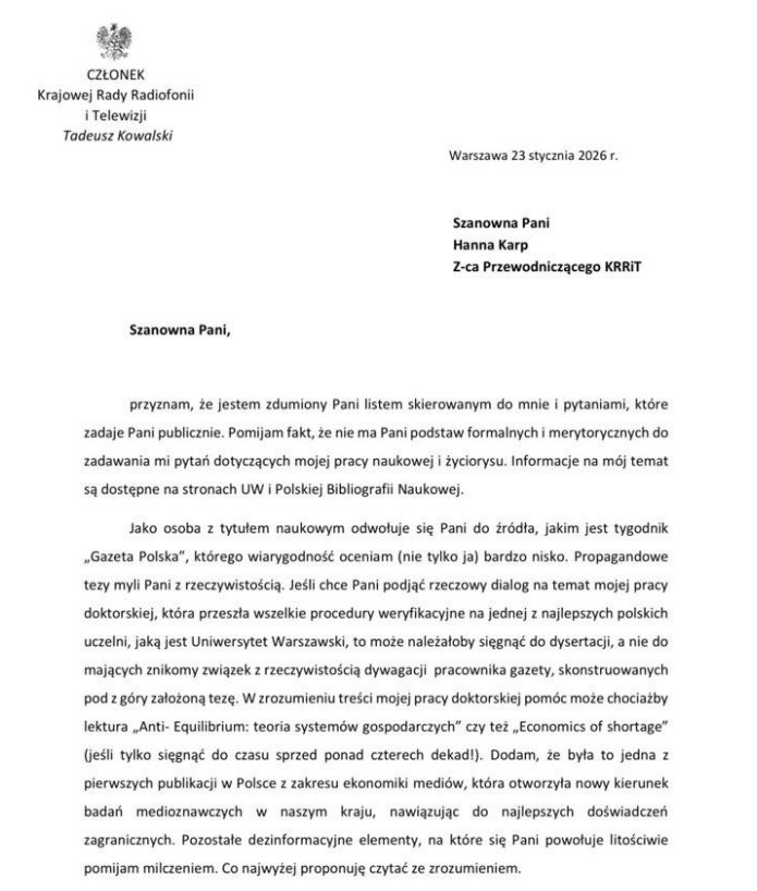 Na tekst zareagowała wiceprzewodnicząca KRRiTV prof. Hanna Karp, która zadała Kowalskiemu kilka pytań, związanych oczywiście z przeszłością członka KRRiTV, którą poznaliśmy w tym tygodniu.