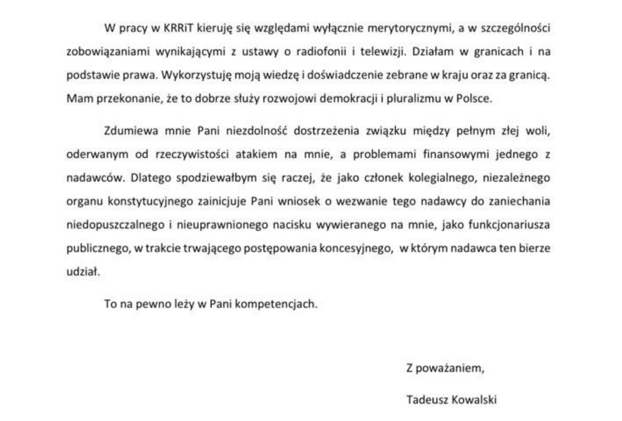 W związku z prasową publikacją na temat drogi naukowo-zawodowej członka Krajowej Rady Radiofonii i Telewizji Tadeusza dr hab. Tadeusza Kowalskiego skierowałam do ministra kilka pytań. Czekam na odpowiedź