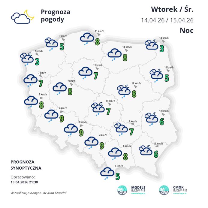 W nocy zachmurzenie całkowite i duże, większe przejaśnienia tylko na krańcach wschodnich oraz nad ranem na północnym zachodzie. Miejscami opady deszczu, głównie na północy, w centrum i na zachodzie. Na północy prognozowana suma opadów miejscami do około 10 mm. Wysoko w Tatrach opady deszczu ze śniegiem.