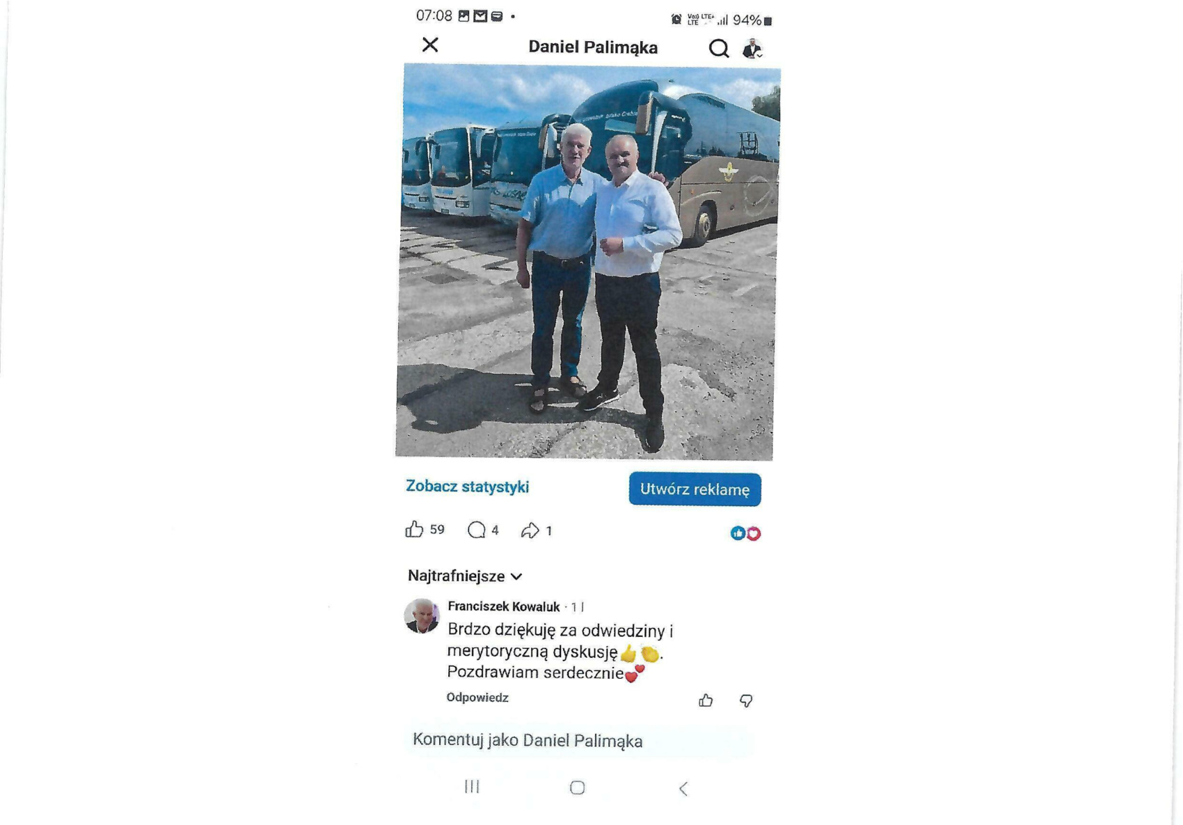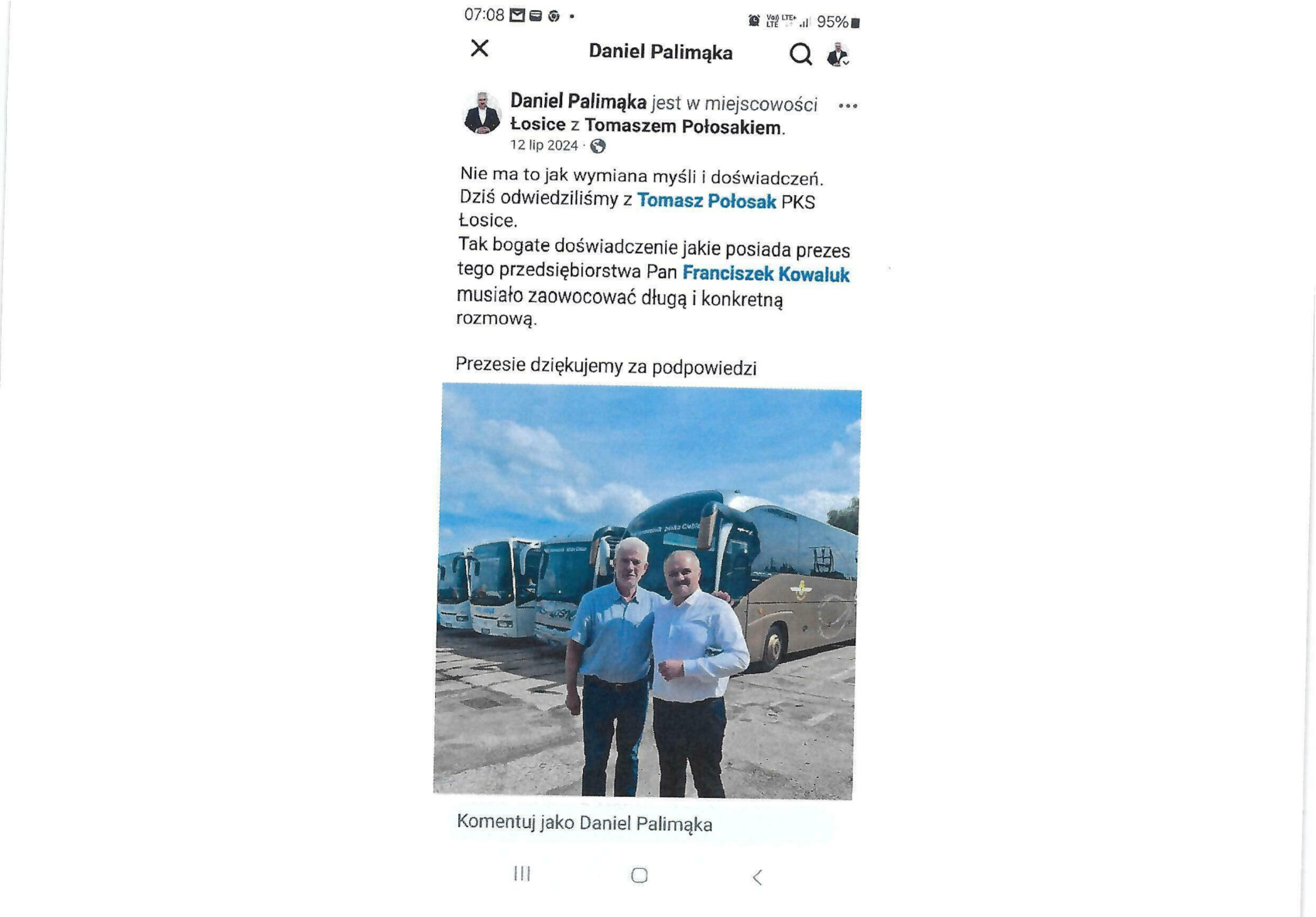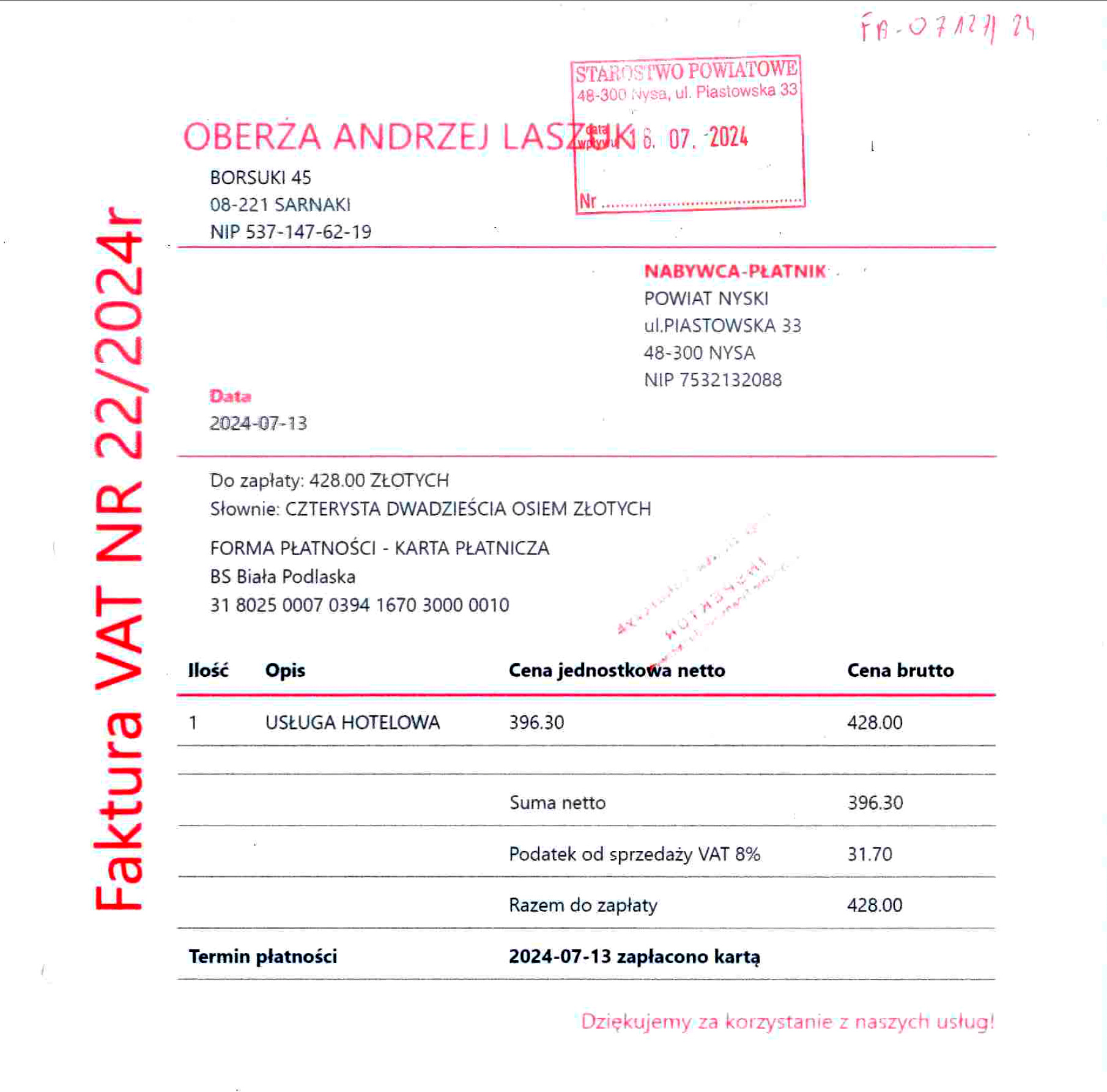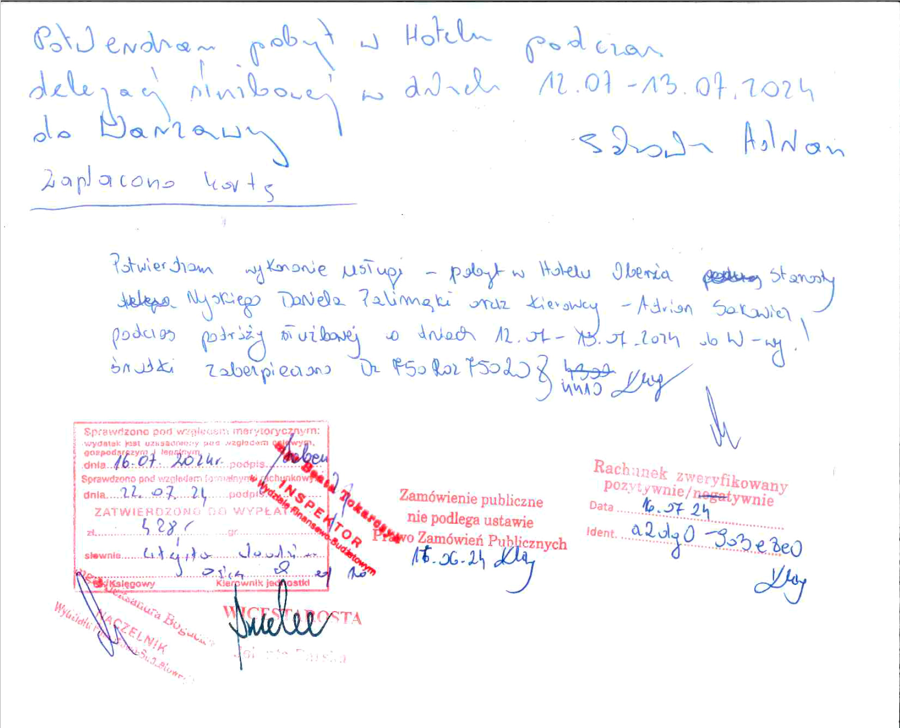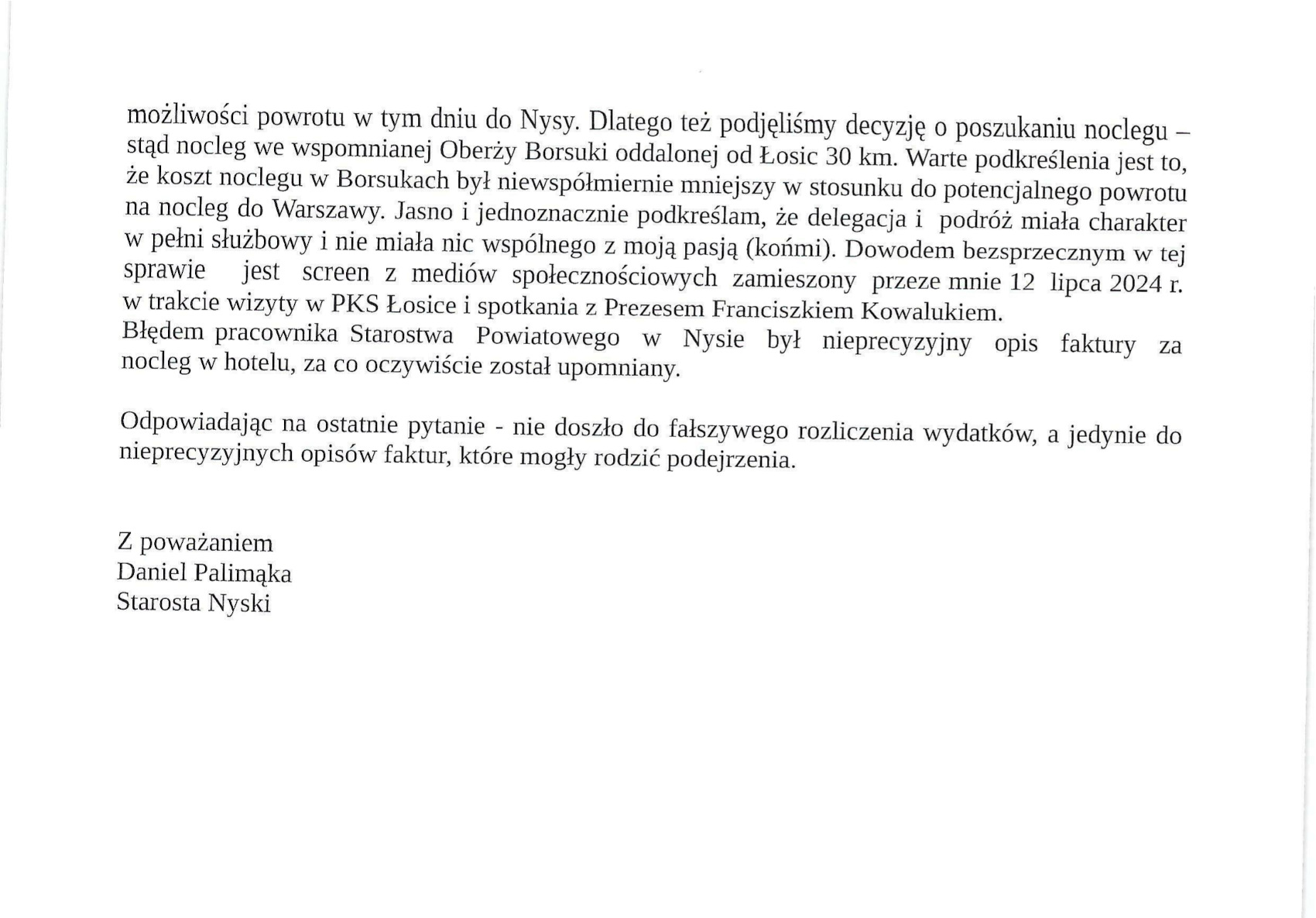 Kartą powiatu płacono też za noclegi starosty Palimąki. 13 lipca 2024 r. kartą nyskiego powiatu opłacono nocleg starosty i jego kierowcy w Oberży Borsuki tuż przy granicy z Białorusią. Koszt: 428 zł. Zaskakiwać może opis faktury: „Potwierdzam pobyt w hotelu podczas delegacji służbowej w dniach 12.07-13.07.2024 do Warszawy”. Może to zaskakiwać, bo Borsuki są oddalone od Stolicy o ok. 140 km.