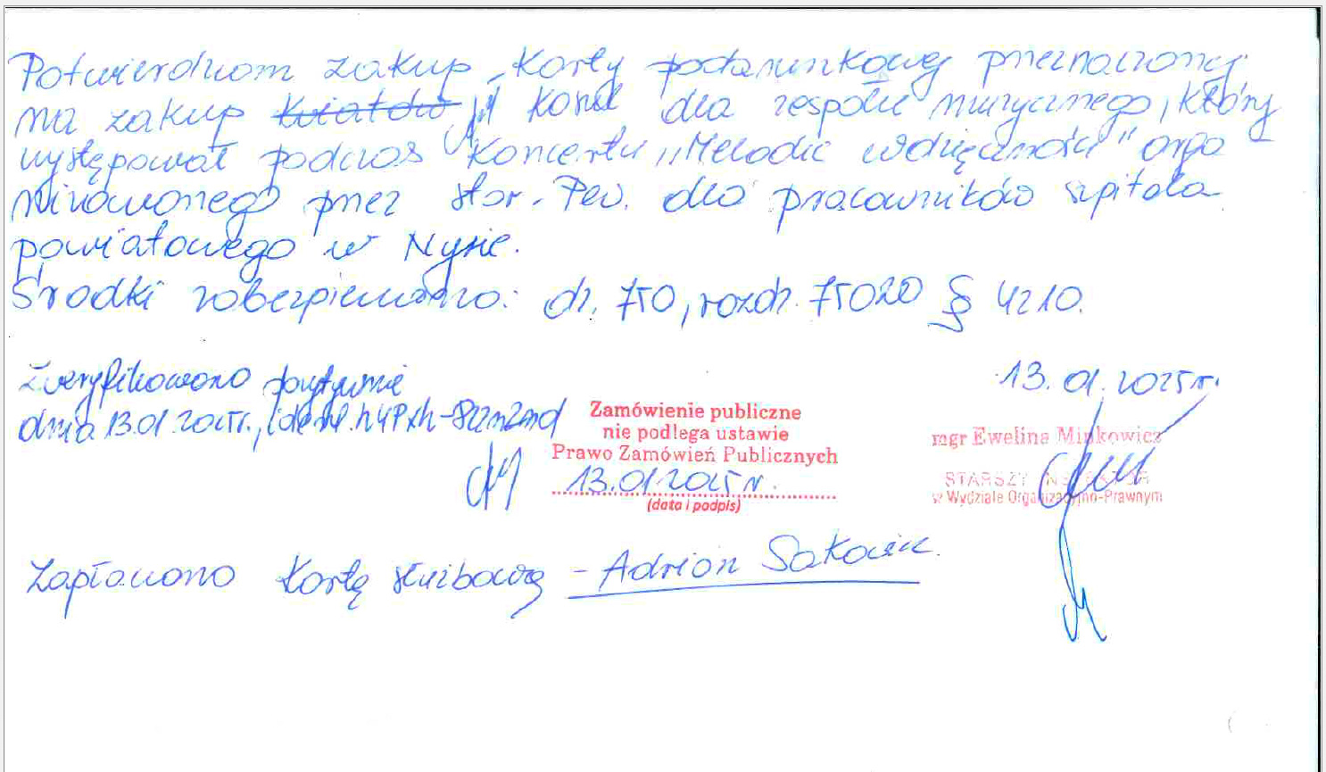 Jak to więc możliwe, że nocleg w miejscowości nad Bugiem został rozliczony w ramach delegacji do Warszawy? To nie jedyne wątpliwości wokół wydatków starostwa kierowanego przez człowieka Siemoniaka. 9 stycznia 2025 r. jeden z kierowców starosty zapłacił tysiąc złotych w jednym ze sklepów odzieżowych w Nysie za kartę podarunkową. Z opisanej faktury za ten zakup wynika, że miała być wymieniona na koszule dla zespołu, który „występował podczas koncertu Melodie Wdzięczności”. Odbył się on dwa dni wcześniej – 7 stycznia – w Nyskim Domu Kultury. Był uhonorowaniem pracowników Szpitala Powiatowego w Nysie za ich postawę i pomoc niesioną podczas ubiegłorocznej powodzi.