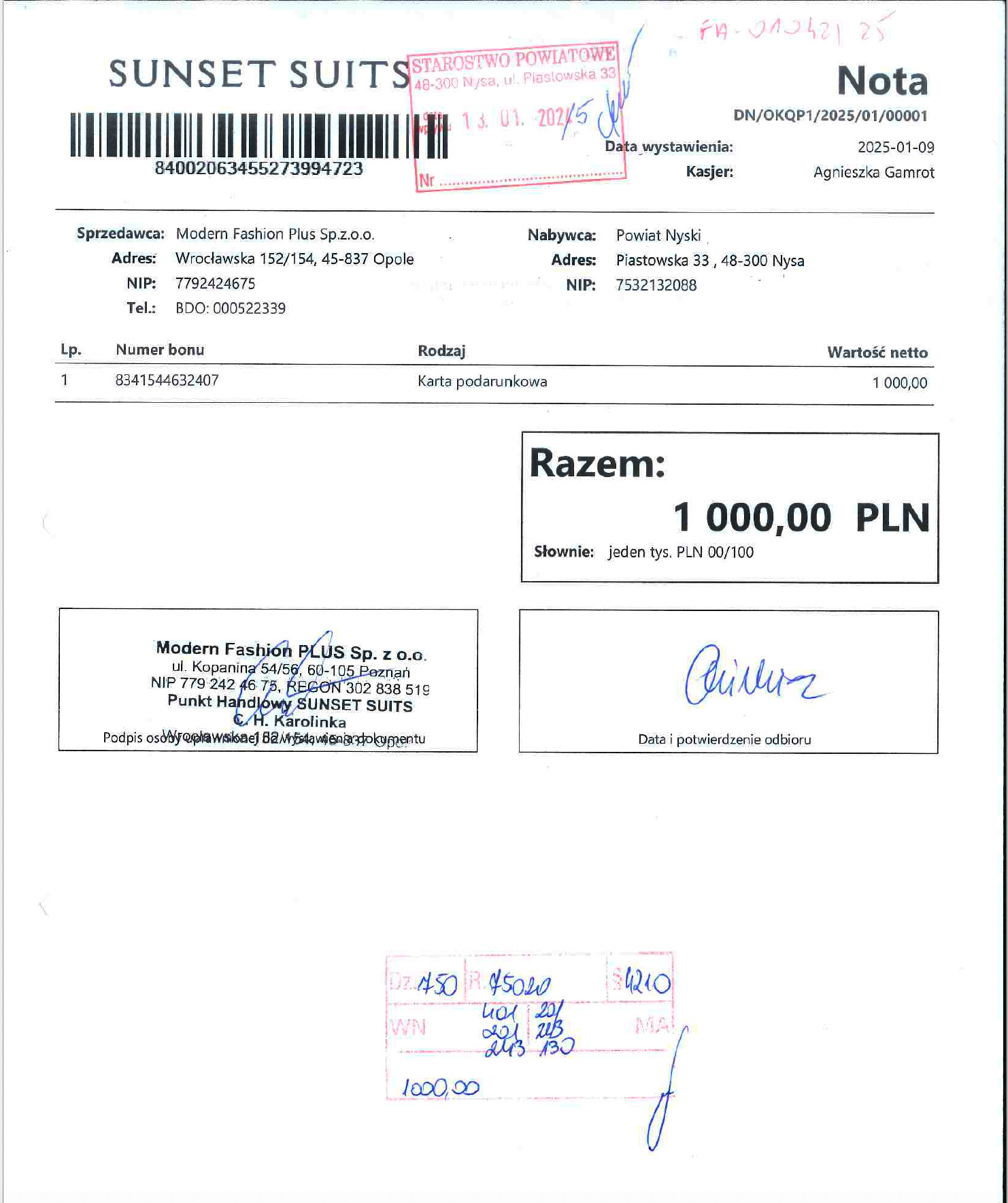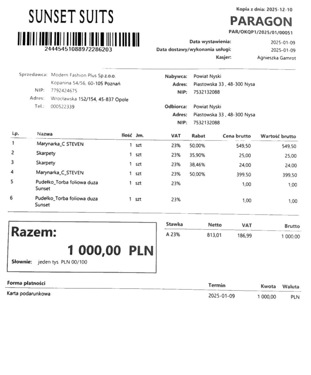 Problem w tym, że żadnych koszul nie kupiono. Stowarzyszenie „Nysa Patrzy” dotarło do paragonu „wymiany karty podarunkowej” nabytej przez nyski powiat. Wynika z niego, że została ona wymieniona na dwie marynarki i dwie pary skarpetek.