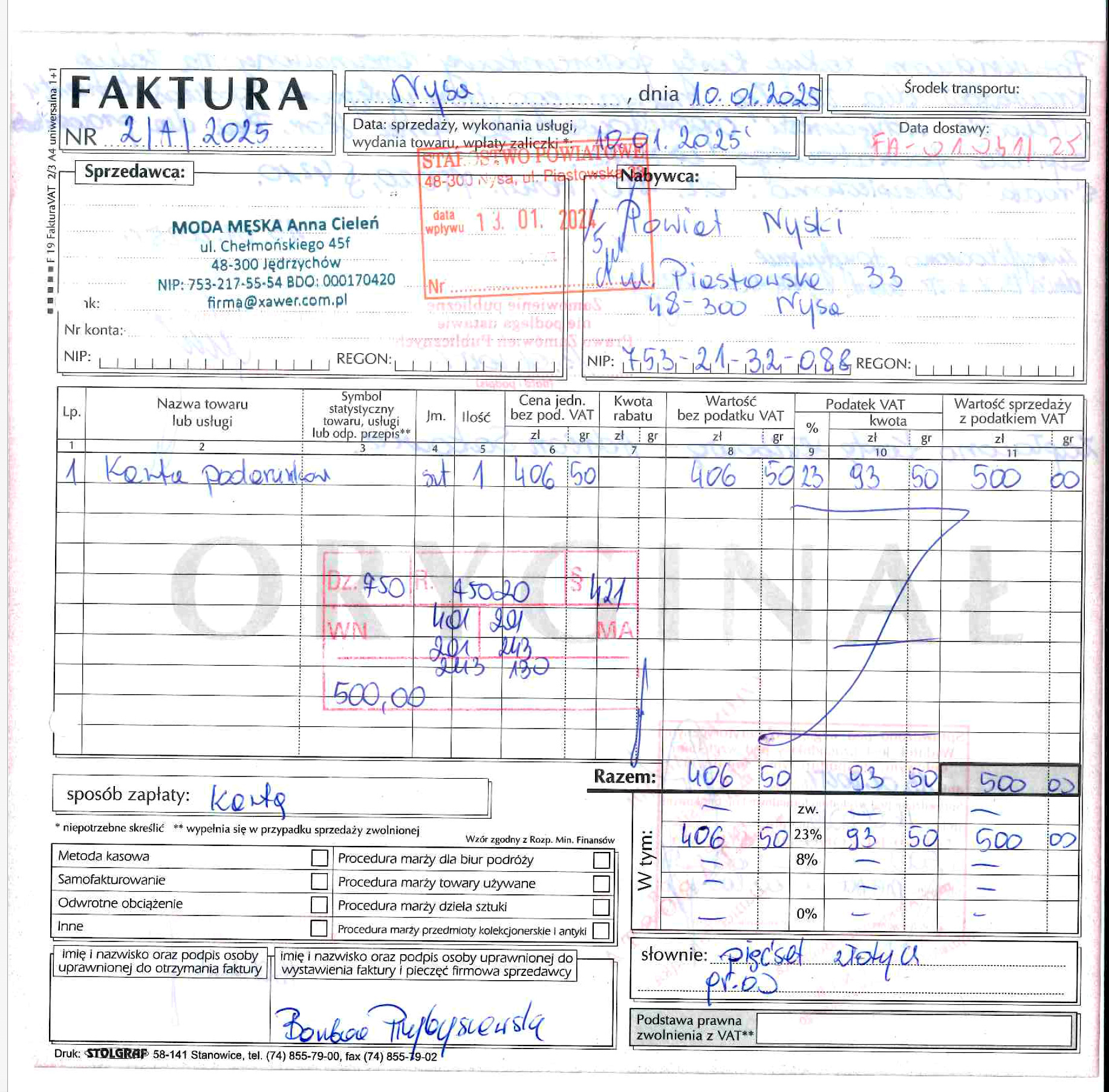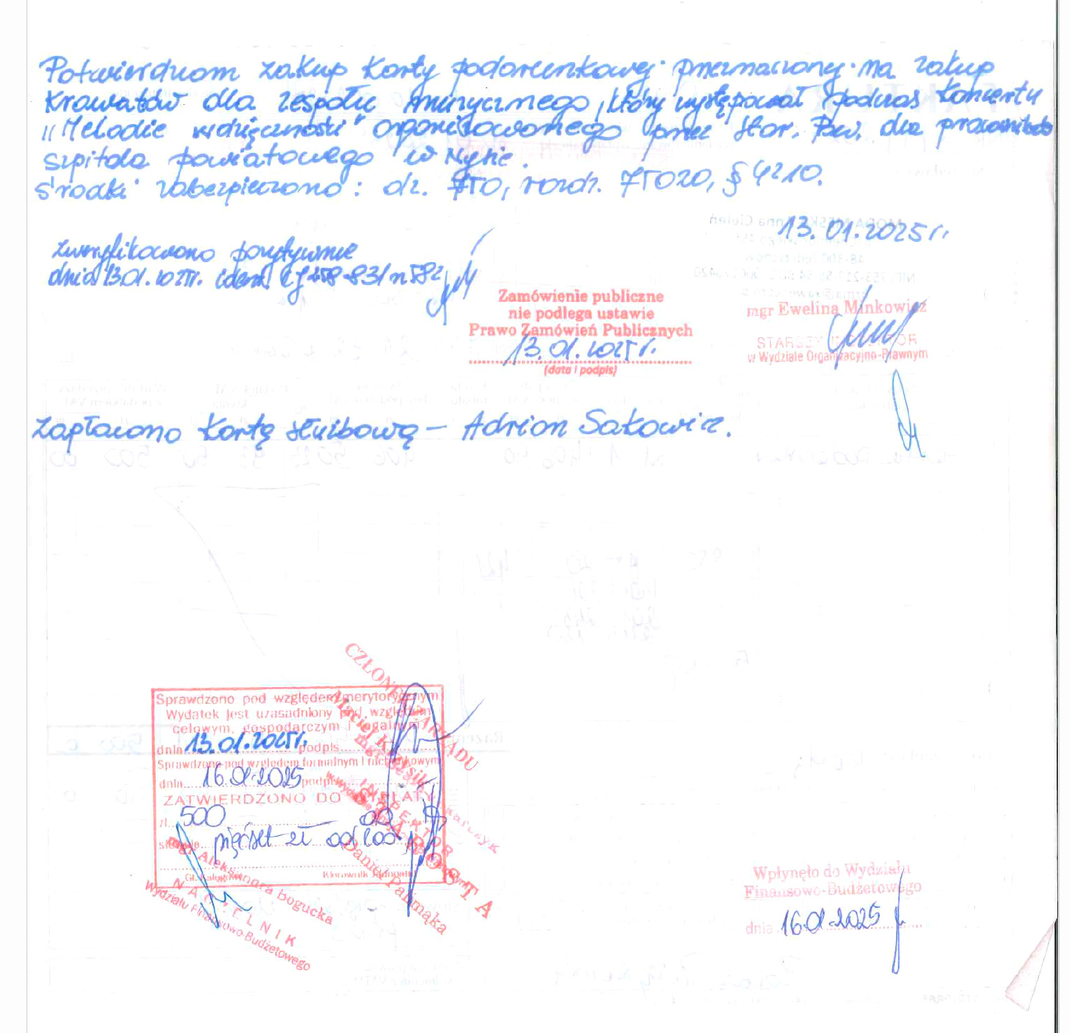 W opisach płatności dokonywanych kartą powiatu są jeszcze dwie inne związane z koncertem „Melodie Wdzięczności”. 10 stycznia 2025 r. zapłacono w ten sposób 500 zł za kartę podarunkową w jednym ze sklepów odzieżowych w miejscowości pod Nysą. Z opisu faktury wynika, że miała być przeznaczona na krawaty dla tego samego, występującego na koncercie, zespołu.