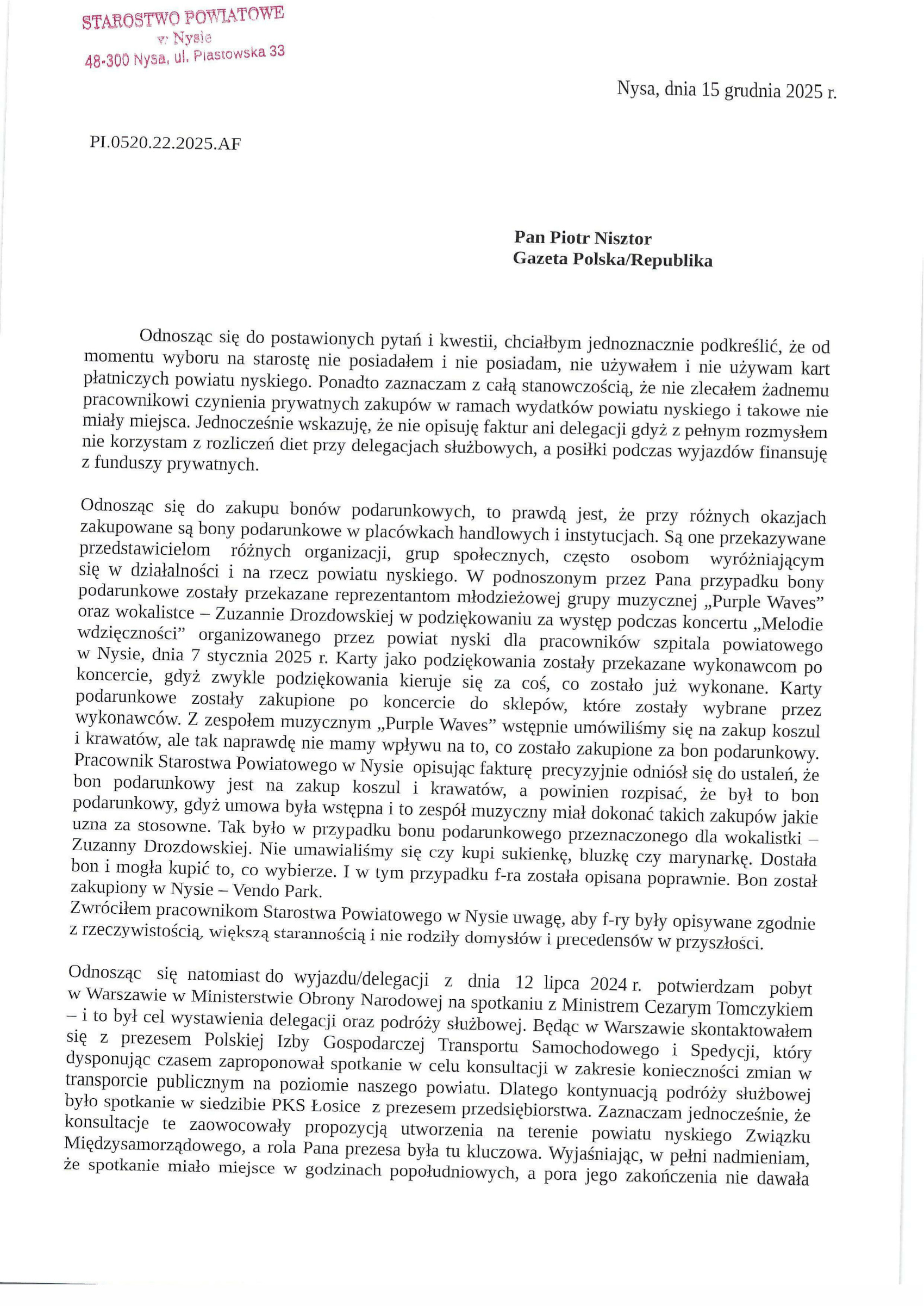 Z kolei 22 stycznia 2025 r. służbową kartą powiatu zapłacono 400 zł za – jak wynika z opisu faktury – kartę upominkową dla jednej z wokalistek koncertu w ramach podziękowania za występ. Kiedy karta została przekazana? Czy zespół muzyczny otrzymał krawaty? To tylko część pytań związanych z wydatkami z kart służbowych nyskiego powiaty jakie Telewizja Republika wysłała do starosty Palimąki. Poniżej publikujemy całą odpowiedź starosty nyskiego.