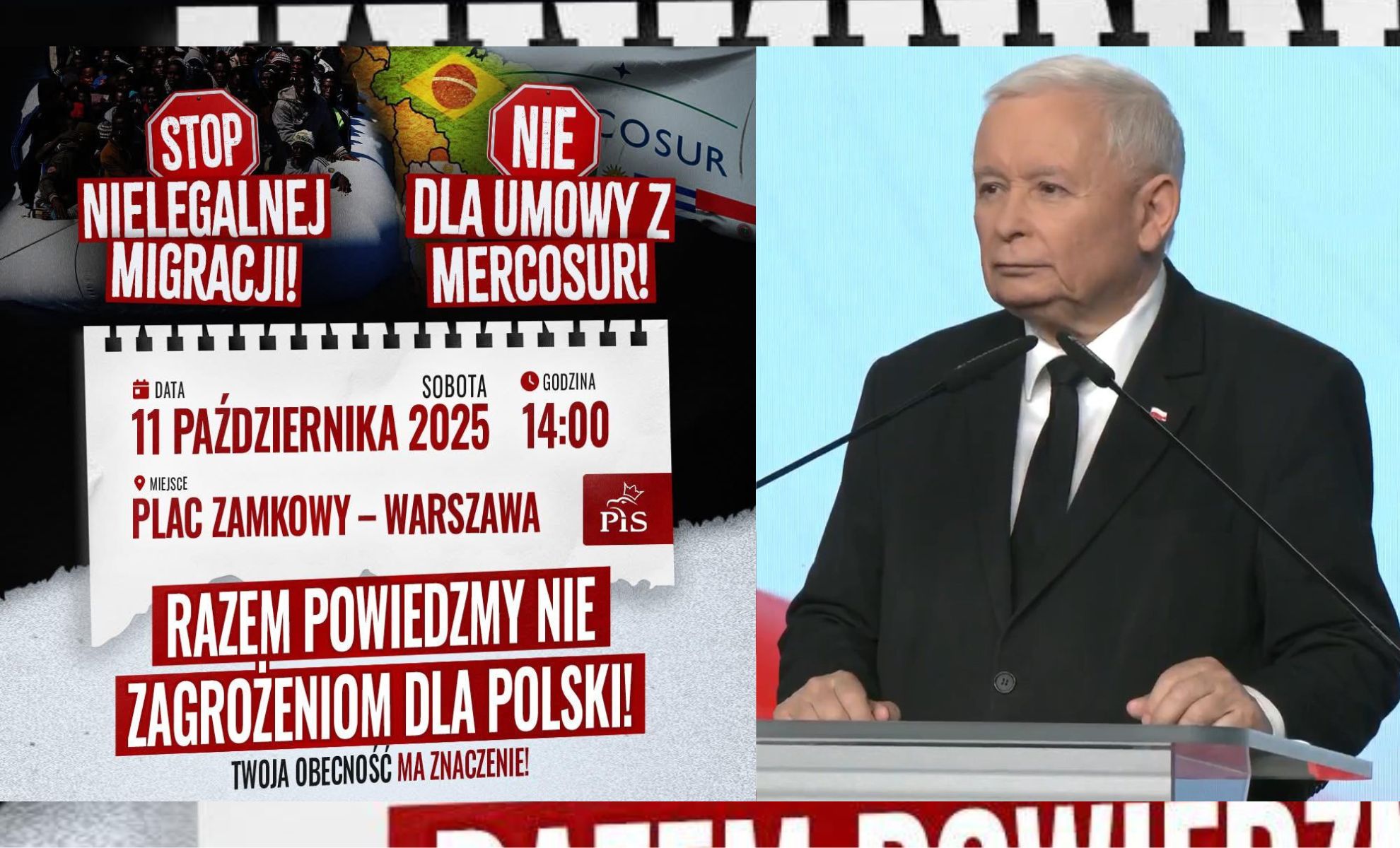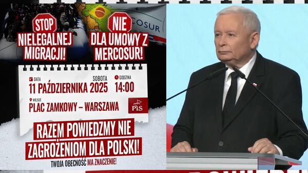 Polacy nie chcą przyjmowania do naszego kraju nielegalnych migrantów i sprzeciwiają się umowie z Mercosur. Oba te unijne projekty realizowane są wbrew narodowemu interesowi i za cichym poparciem rządu 13 grudnia. 11 października (sobota) na Placu Zamkowym w Warszawie odbędzie się protest, pokazujący brak zgody dla tych planów dla Polski realizowanych przez Brukselę. Na manifestację na platformie X zaprosił właśnie prezes PiS Jarosław Kaczyński, który przekonuje, że trzeba zatrzymać władzę, która "szkodzi Polsce każdego dnia".
