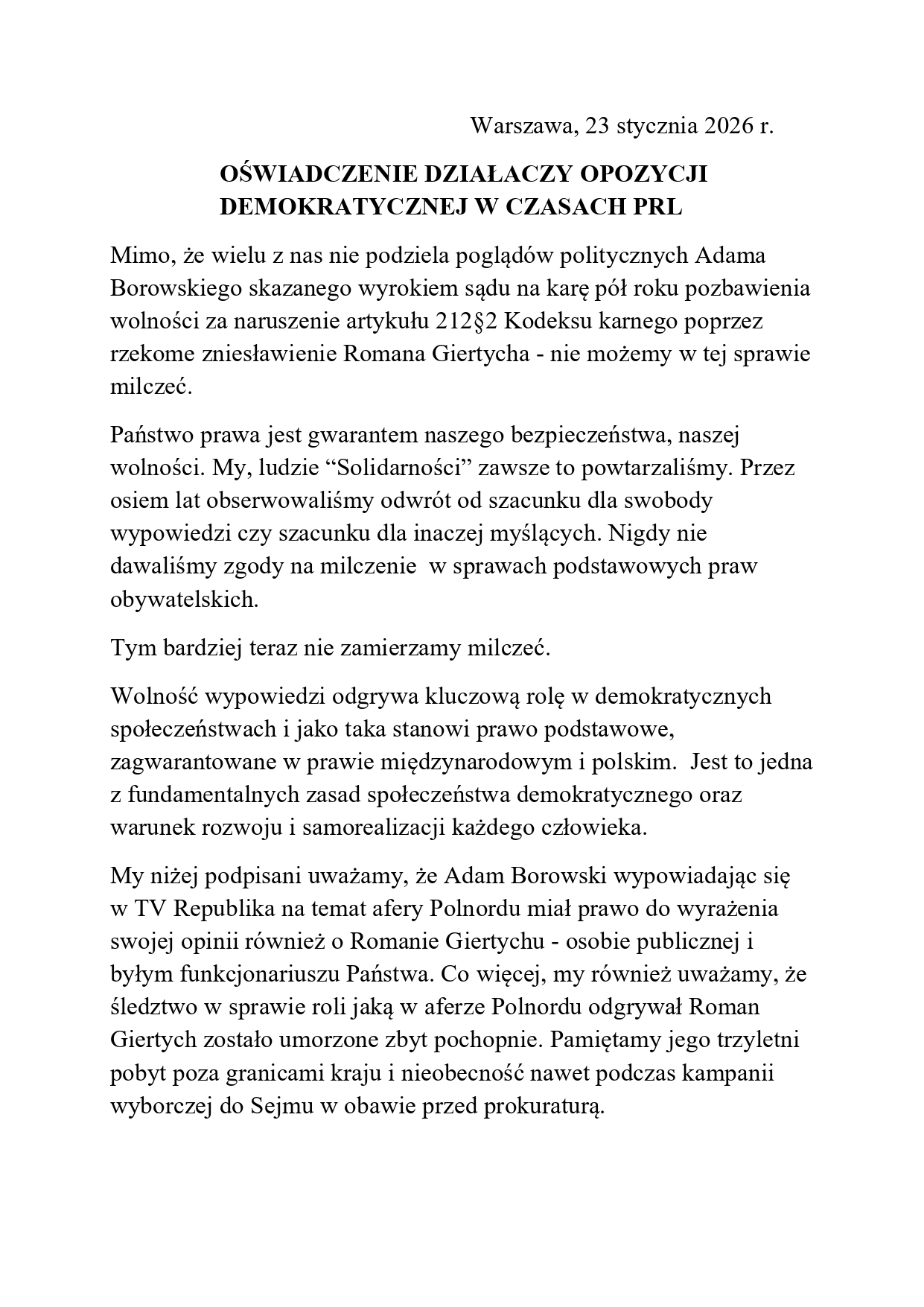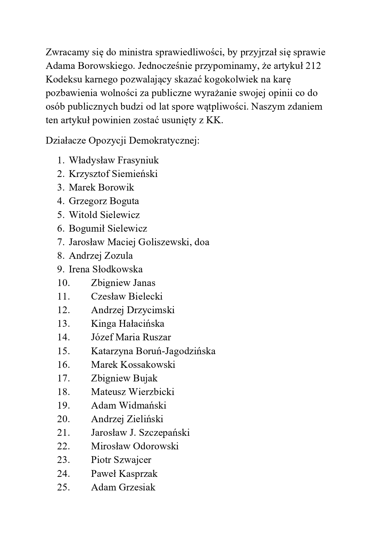 „Mimo, że wielu z nas nie podziela poglądów politycznych Adama Borowskiego skazanego wyrokiem sądu na karę pół roku pozbawienia wolności za naruszenie artykułu 212§2 Kodeksu karnego poprzez rzekome zniesławienie Romana Giertycha - nie możemy w tej sprawie milczeć” – napisali działacze Opozycji Demokratycznej. Pod listem podpisało się 25 osób.
