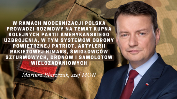 Minister jest zainteresowany kolejnymi dostawami systemów artylerii rakietowej HIMARS oraz systemów Patriot. Dodał też, że prowadzi rozmowy na temat zakupu śmigłowców szturmowych, bezzałogowców oraz "kolejnych eskadr samolotów wielozadaniowych". Zakup śmigłowców bojowych, które zastąpią Mi-24, zapisano w planie modernizacji technicznej na lata 2021-35 jako program Kruk. Przed rokiem wiceszef MON Wojciech Skurkiewicz zapowiadał, że dostawy nie rozpoczną się przed rokiem 2024.