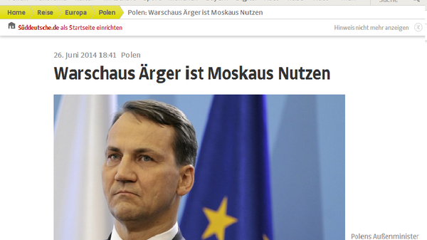 Jego zdaniem skandal podsłuchowy uderzył w polski rząd w najbardziej nieodpowiednim momencie, gdyż właśnie teraz chciałby on w związku z kryzysem na Ukrainie zaakcentować na forum UE i NATO wyraźniej swój sprzeciw wobec gróźb Rosji. Jedną z najważniejszych postaci w tej grze jest minister spraw zagranicznych Radosław Sikorski, który wskutek afery "ucierpiał najbardziej – czytamy w "SZ".