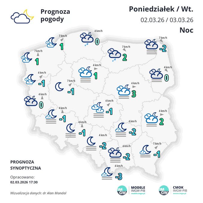 W nocy na północy i wschodzie kraju zachmurzenie umiarkowane i duże i tam możliwe słabe opady deszczu lub mżawki. Miejscami mgły ograniczające widzialność do 200 m, a na południu nawet do 100 m