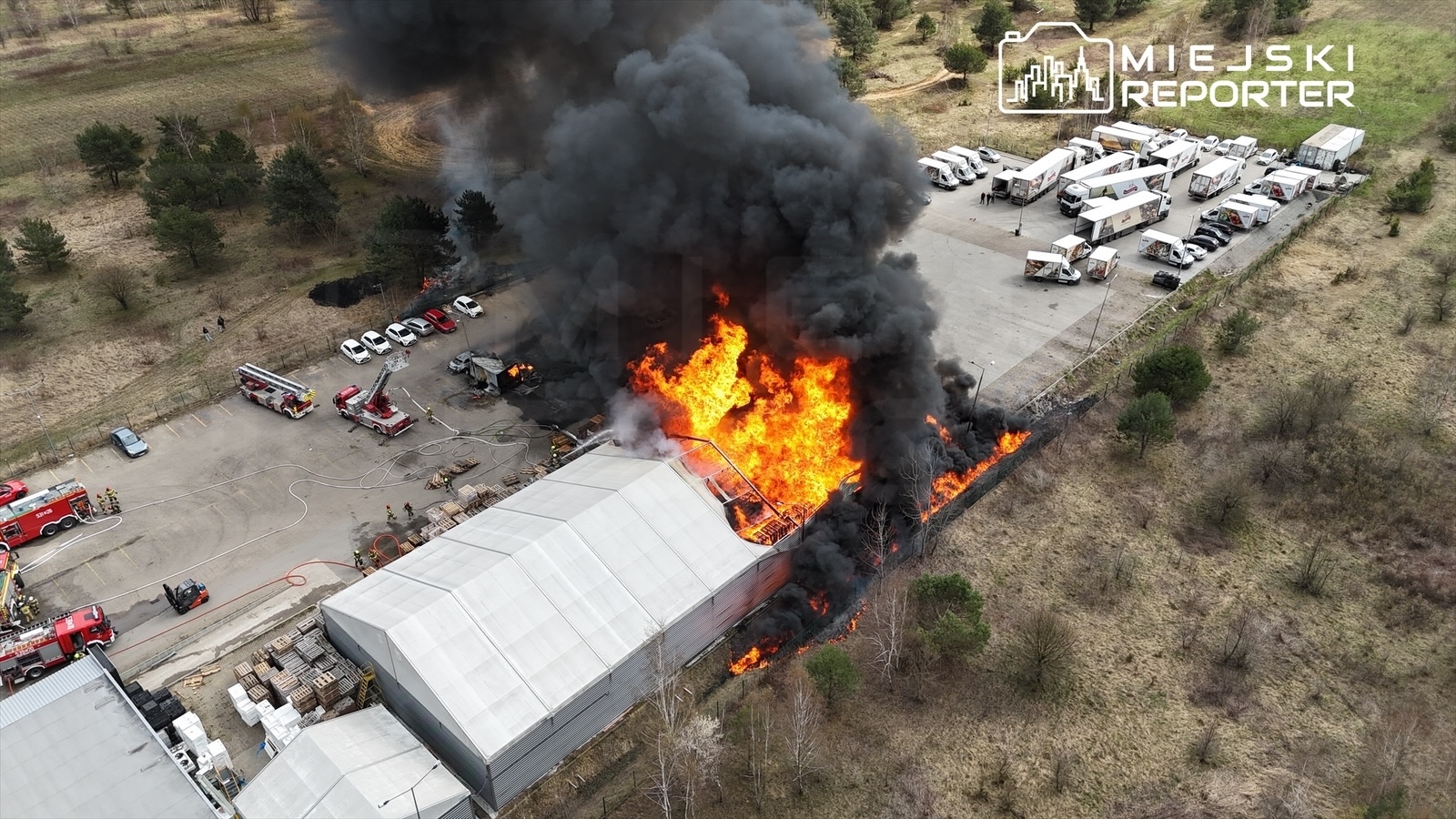 Z przekazanych informacji wynika, że pożar rozpoczął się od zbiornika z paliwem. W krótkim czasie ogień objął kolejne elementy znajdujące się w sąsiedztwie – palety, pojazdy oraz fragment hali hurtowni spożywczej. Na miejscu trwa rozbudowana akcja gaśnicza