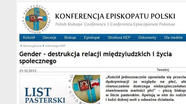 Zorganizowana 20 grudnia Konferencja Episkopatu Polski poświęcona była ideologii gender. Biskupi mówili o niebezpieczeństwach, jakie genderyzm niesie dla życia społecznego. "(...) Ideologia gender bez wiedzy społeczeństwa i zgody Polaków od wielu miesięcy wprowadzana jest w różne struktury życia społecznego: edukację, służbę zdrowia, działalność placówek kulturalno-oświatowych i organizacji pozarządowych" - głosi przygotowany na najbliższą niedzielę list pasterski.