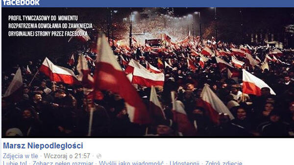 Wczoraj po godzinie 23 prezes stowarzyszenia Marsz Niepodległości Witold Tumanowicz w oficjalnym oświadczeniu poinformował o skasowaniu profilu na Facebooku. Według podanych w nim informacji portal wysłał do administratora profilu dwa komunikaty uzasadniające przyczynę blokady":