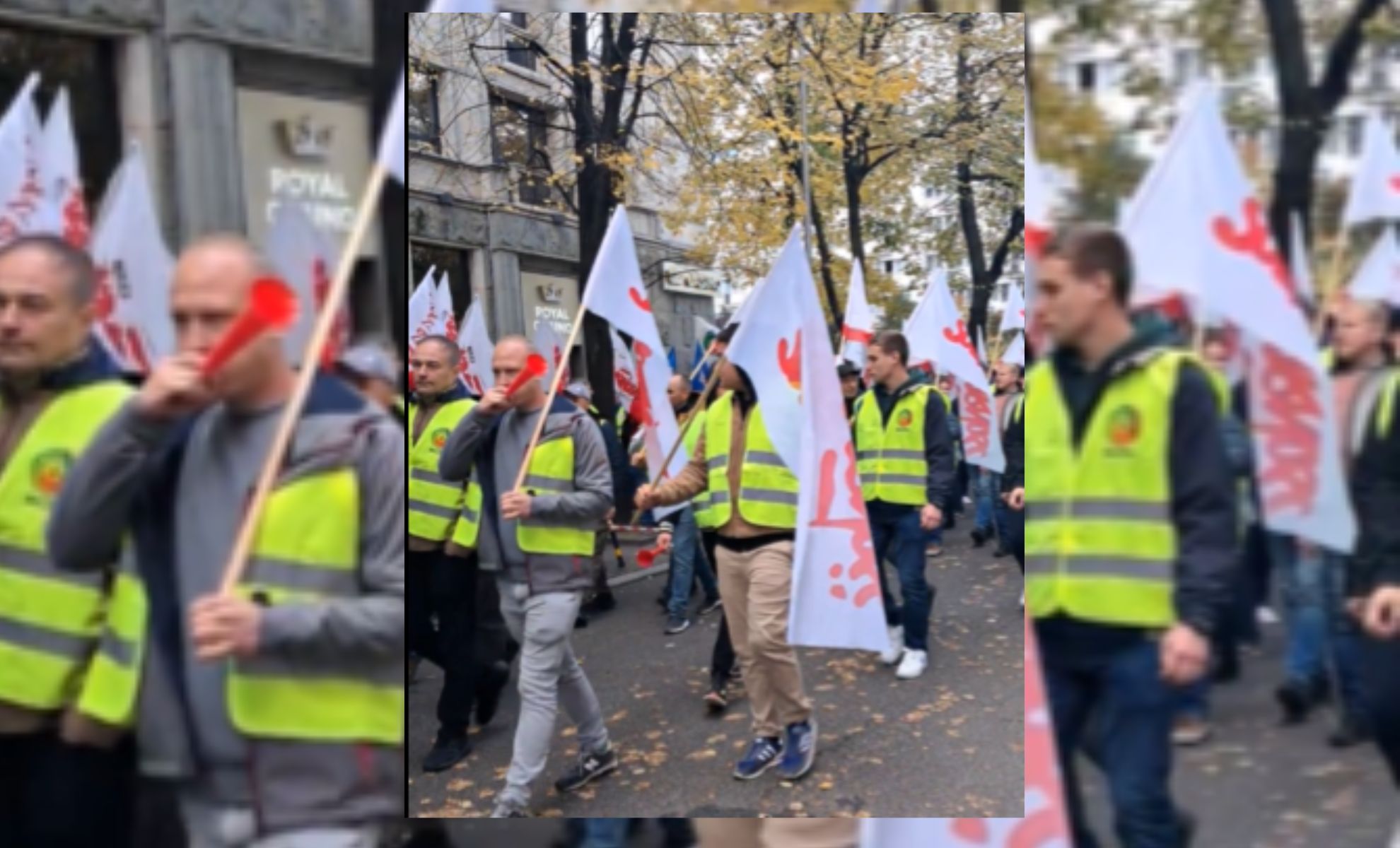 Pracownicy Enei zrzeszeni w Solidarności protestują w Warszawie.
