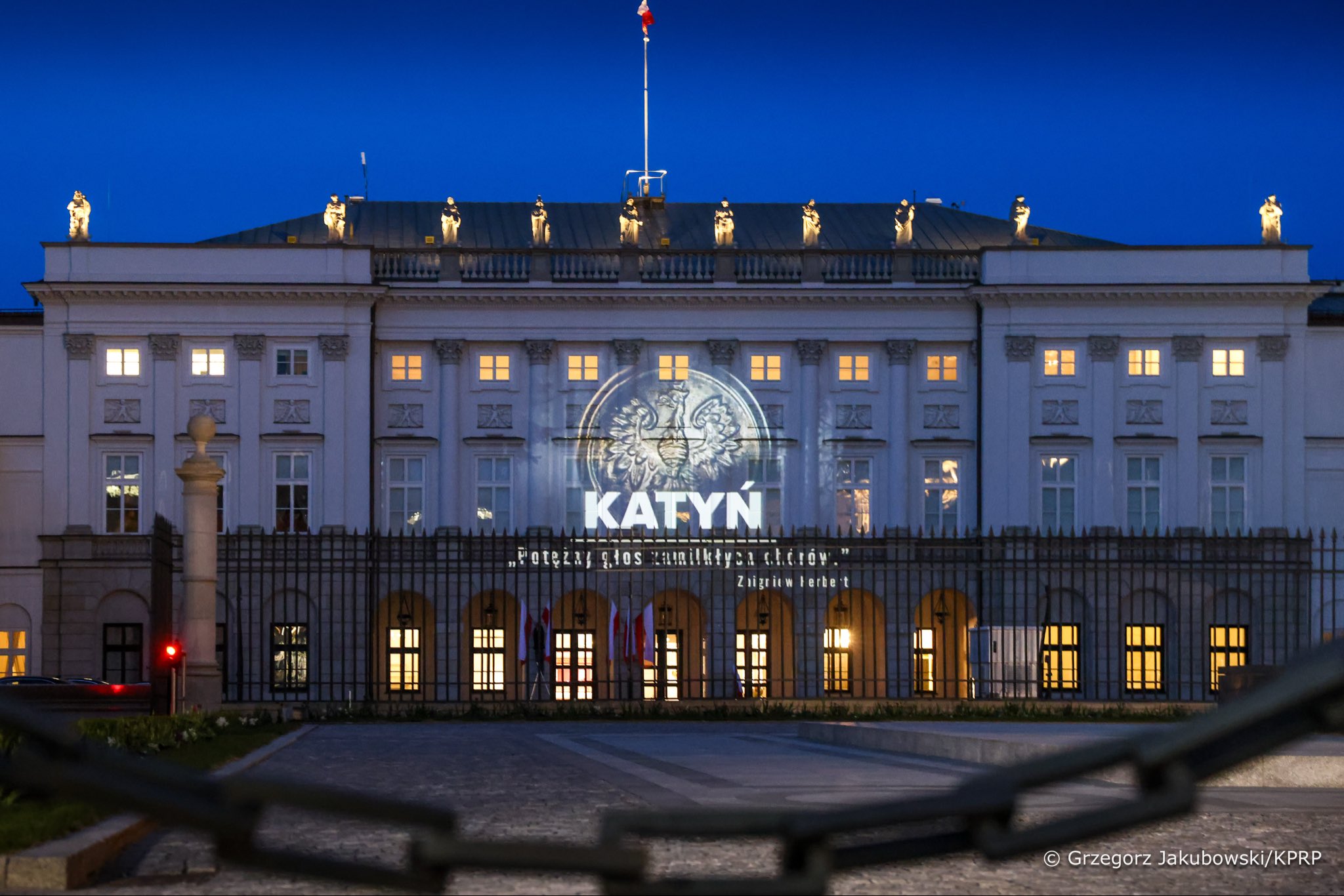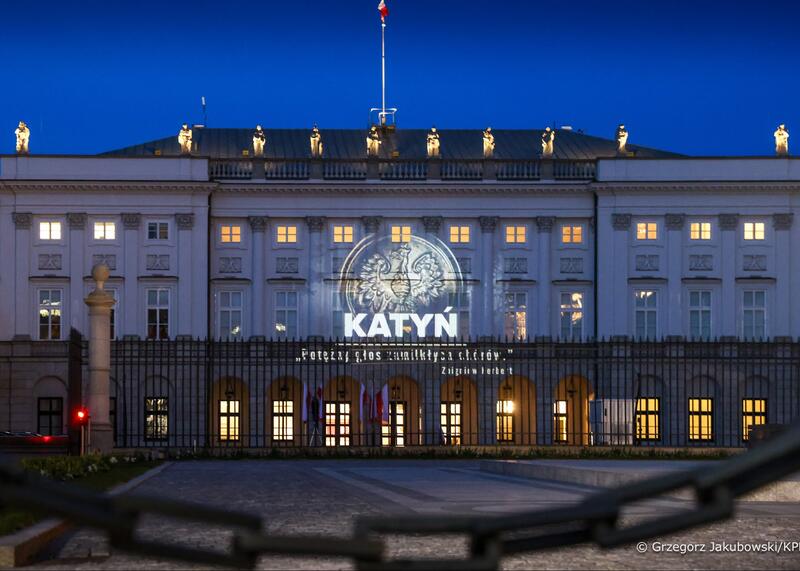 21:21 Z okazji Dnia Pamięci Ofiar Zbrodni Katyńskiej wieczorem na fasadzie Pałacu Prezydenckiego została wyświetlona iluminacja, którą tworzy m.in. napis Katyń oraz słowa poety Zbigniewa Herberta „Katyń to potężny głos zamilkłych chórów”