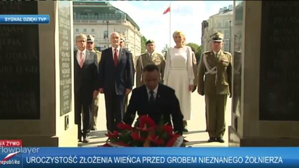 Prezydent RP Andrzej Duda złożył wieniec przed Grobem Nieznanego Żołnierza. Towarzyszyła mu Pierwsza Dama, Agata Kornshauser-Duda.