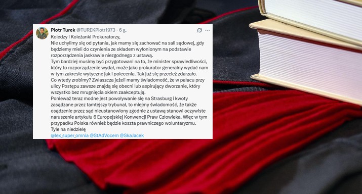 „Koledzy i Koleżanki Prokuratorzy, nie uchylimy się od pytania, jak mamy się zachować na sali sądowej, gdy będziemy mieli do czynienia ze składem wyłonionym na podstawie rozporządzenia jaskrawie niezgodnego z ustawą" – tak zaczyna się wpis opublikowany na platformie "X", którego autorem jest prokurator Piotr Turek.