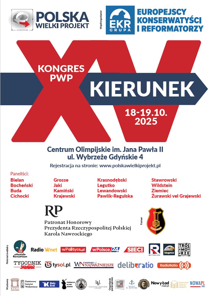 Fundacja Polska Wielki Projekt oraz Grupa Europejskich Konserwatystów i Reformatorów mają zaszczyt zaprosić Państwa na XV Kongres Polska Wielki Projekt – Kierunek. Wydarzenie objęte honorowym patronatem Prezydenta RP Karola Nawrockiego odbędzie się w dn. 18-19 października 2025 r. w Centrum Olimpijskim im. Jana Pawła II przy ul. Wybrzeże Gdyńskie 4 w Warszawie.