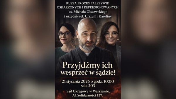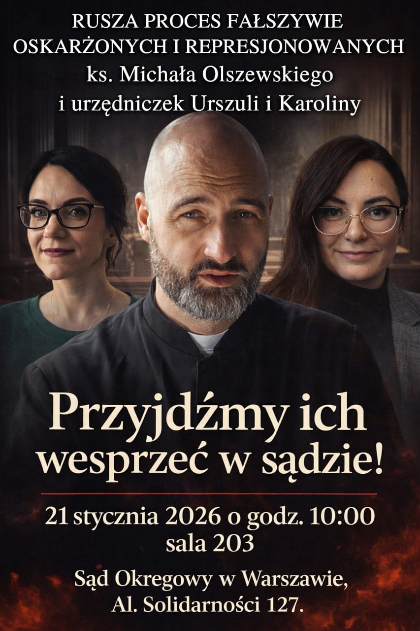 21 stycznia 2026 o godz. 10:00 w Sądzie Okręgowym w Warszawie, przy Al. Solidarności 127 (sala 203) rusza proces ks. Michała Olszewskiego oraz dwóch urzędniczek - Karoliny i Urszuli.