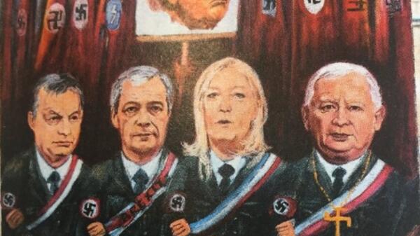 "Świat znalazł się na krawędzi" – informuje w artykule niemiecki tygodnik "Der Spiegel". Zdaniem gazety, rok 2017 będzie rozstrzygający dla przyszłości Zachodu. Gazeta swój artykuł zilustrowała obrazkiem przedstawiającym pięciu polityków: Donalda Trumpa, Viktora Orbana, Nigela Farage\'a, Marine Le Pen oraz Jarosława Kaczyńskiego. Wszyscy ubrani są w mundury ze swastykami. Na szyi prezesa Prawa i Sprawiedliwości wisi dodatkowo duży krzyż.