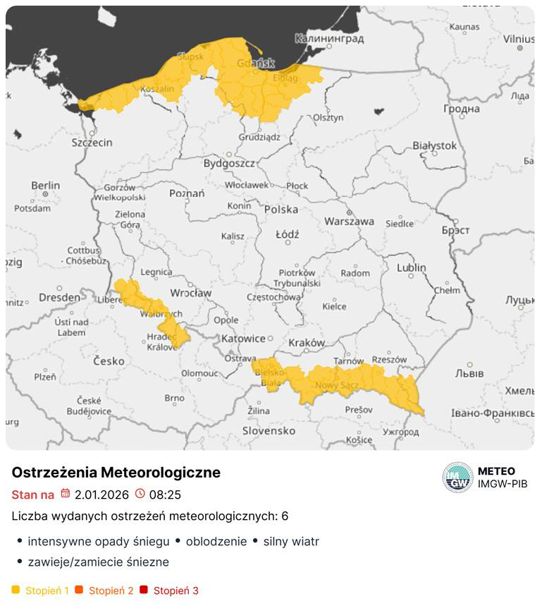 • woj. pomorskie, poza częścią zachodnią i zachodnie powiaty woj. warmińsko-mazurskiego: stopień 1 – do godz. 09:00 dnia 2.01.2026.