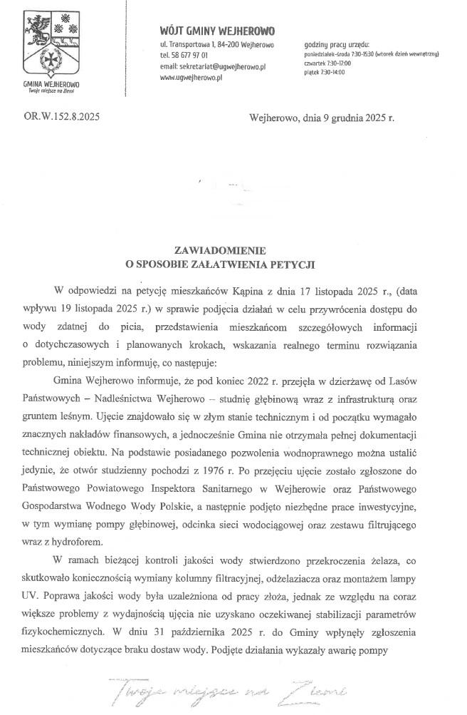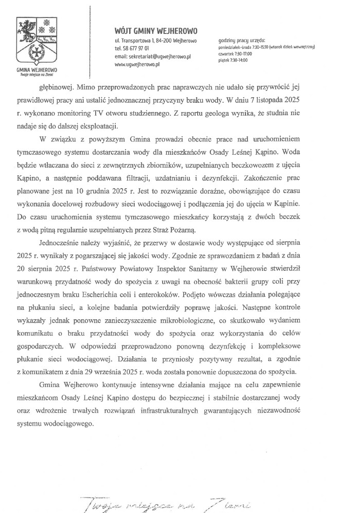 Do dziś nie zrealizowano żadnej inwestycji. W połowie sierpnia 2025 zaczęły się poważne problemy – woda raz była, raz jej nie było. Próby ograniczenia żelaza w wodzie zakończyły się fiaskiem. 30 października woda całkowicie się skończyła. Od tego czasu korzystaliśmy jedynie z beczkowozów.