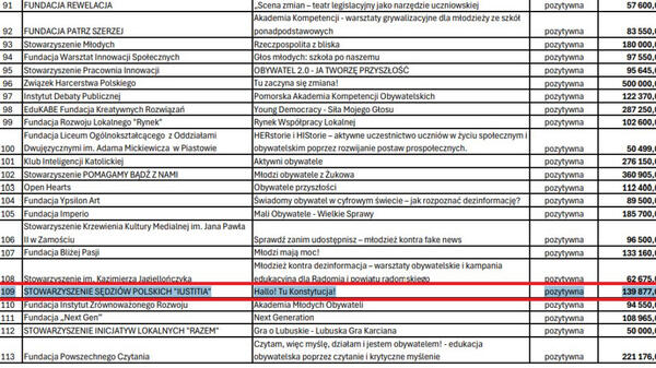 Okazuje się, że pieniądze, i to niemałe, otrzyma m.in. Stowarzyszenie Sędziów Polskich „Iustitia” za projekt „Hallo! Tu Konstytucja!”. Kwota – jedyne 139 877 zł.