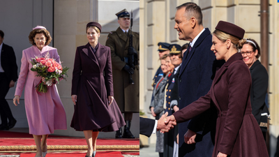 Bordowa stylizacja Marty Nawrockiej przyciągnęła uwagę podczas wizyty szwedzkiej pary królewskiej