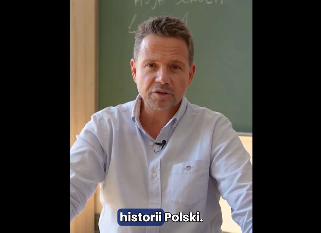Rafał Trzaskowski, na tle szkolnej tablicy, wspomina nauczycieli, padają konkretne nazwiska. Mówi o swoich ulubionych przedmiotach i o tym, że nie pamięta złych nauczycieli. Mówi też o tym, że warto szanować nauczycieli.