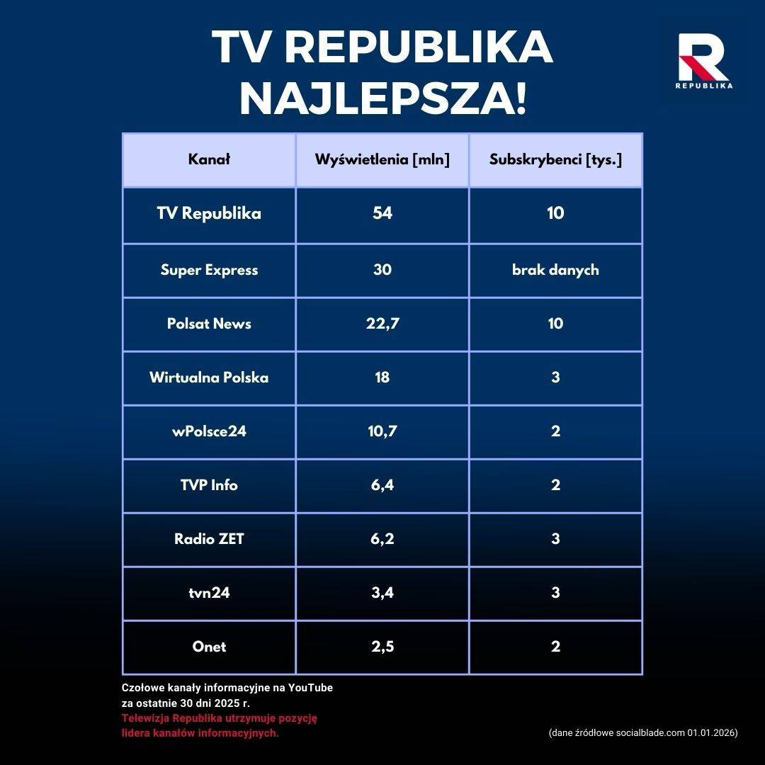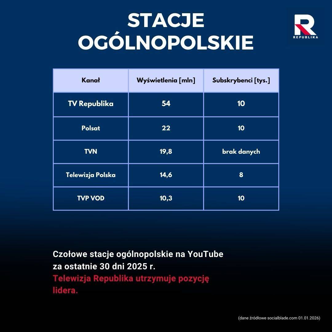 Rok 2025 zakończył się dla nas świetną informacją! Kanał Telewizji Republika na platformie YouTube wyprzedził wszystkie stacje ogólnopolskie, notując 54 miliony wyświetleń i zdobywając 10 tysięcy nowych subskrybentów. To wynik, który kolejny raz pokazuje: Republika nie ma sobie równych - i to przez cały rok, o czym informowaliśmy Państwa na bieżąco! A to wszystko dzięki Państwu - naszym wspaniałym widzom.