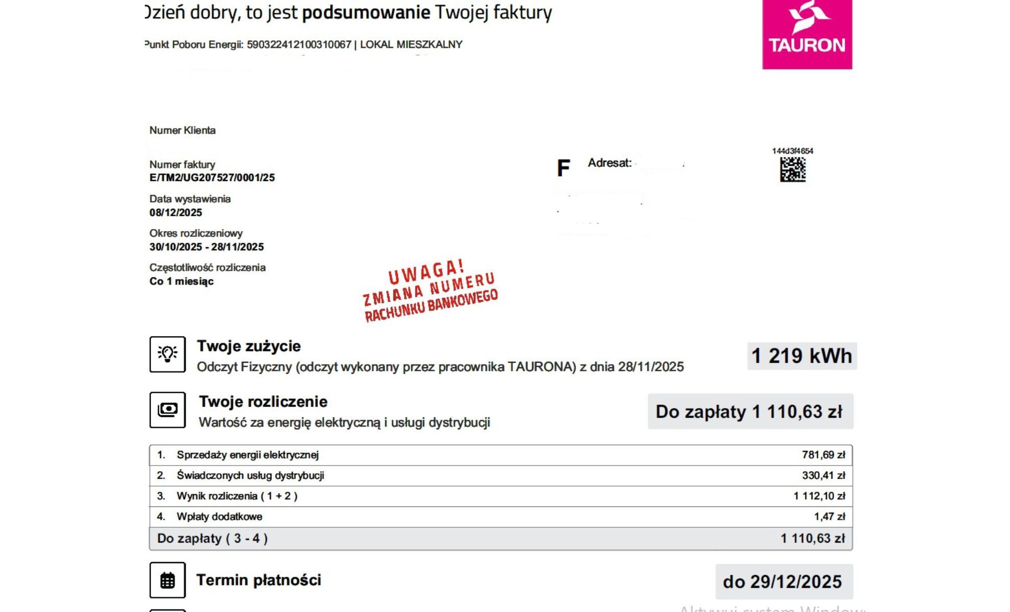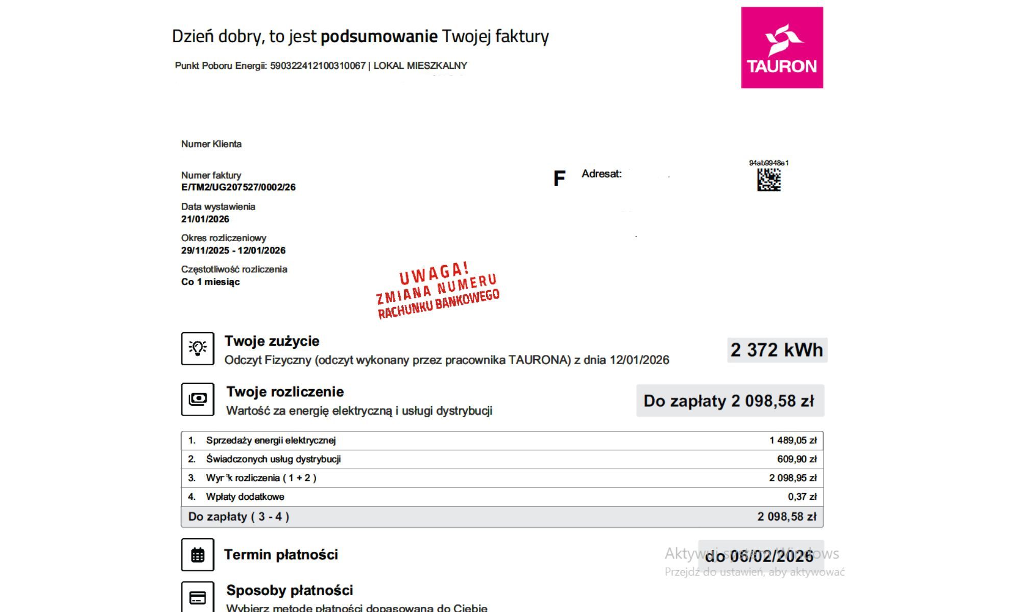 Rachunek za prąd w ciągu miesiąca wzrósł naszemu Czytelnikowi z Legnicy o prawie 100 proc. Za okres od 29 listopada do 12 stycznia firma Tauron chce teraz od Pana Adama (nazwisko znane redakcji) blisko 2100 zł. Poprzedni rachunek (obejmujący ostatni dzień października i listopad - do 28 dnia miesiąca) wystawiony mężczyźnie wyniósł... nieco ponad 1100 zł. Emeryt zastanawia się teraz z czego zapłaci obecną fakturę. Czasu zostało niewiele - termin płatności upływa 6 lutego.